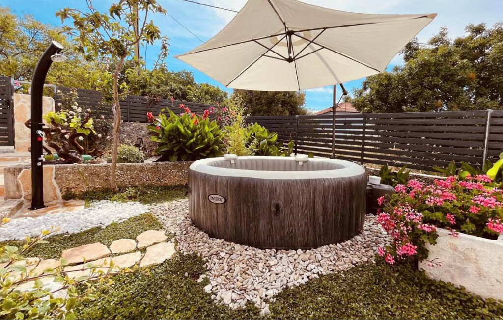 Bien-être à l'extérieur : Location de vacances disposant de chaises-longues et d'un ou plusieurs équipements tels que piscine extérieure, jacuzzi extérieur, lit à baldaquin de jardin etc...