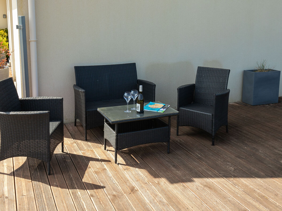Meubles de terrasse, barbecue (portable), chaises longues (4), réduit.
