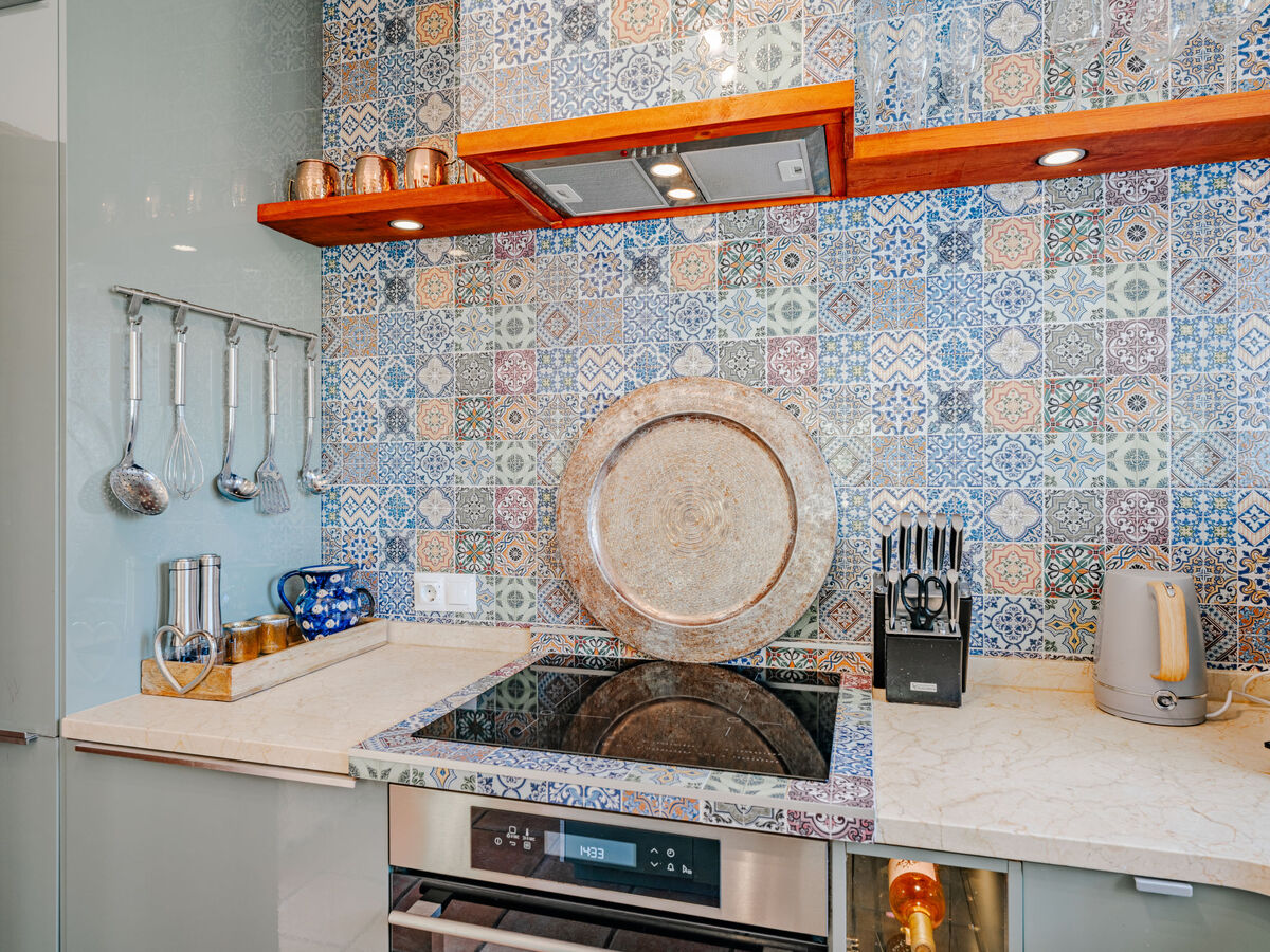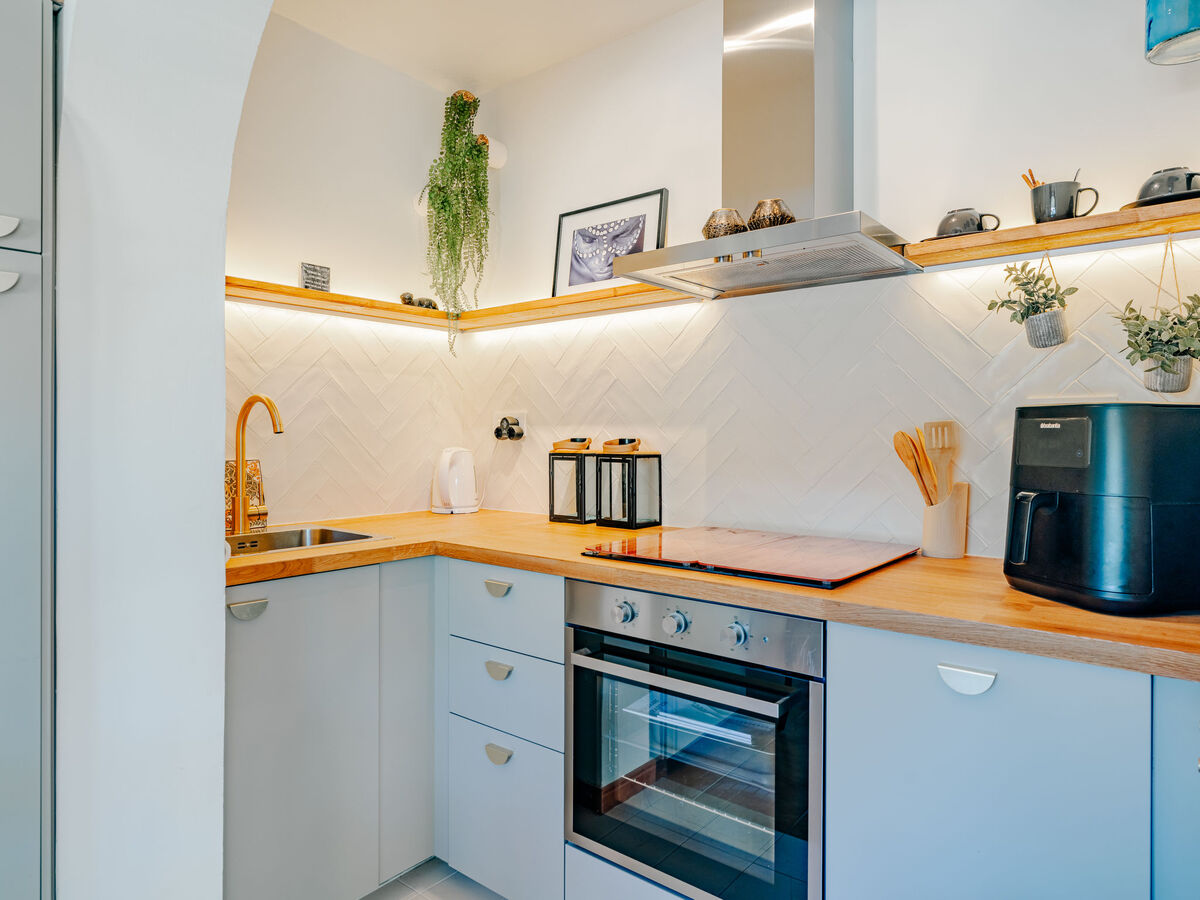 Grande cuisine ouverte (four, lave-vaisselle, 4 plaques à induction, grille-pain, bouilloire électrique, micro-ondes, congélateur, cafetière électrique).