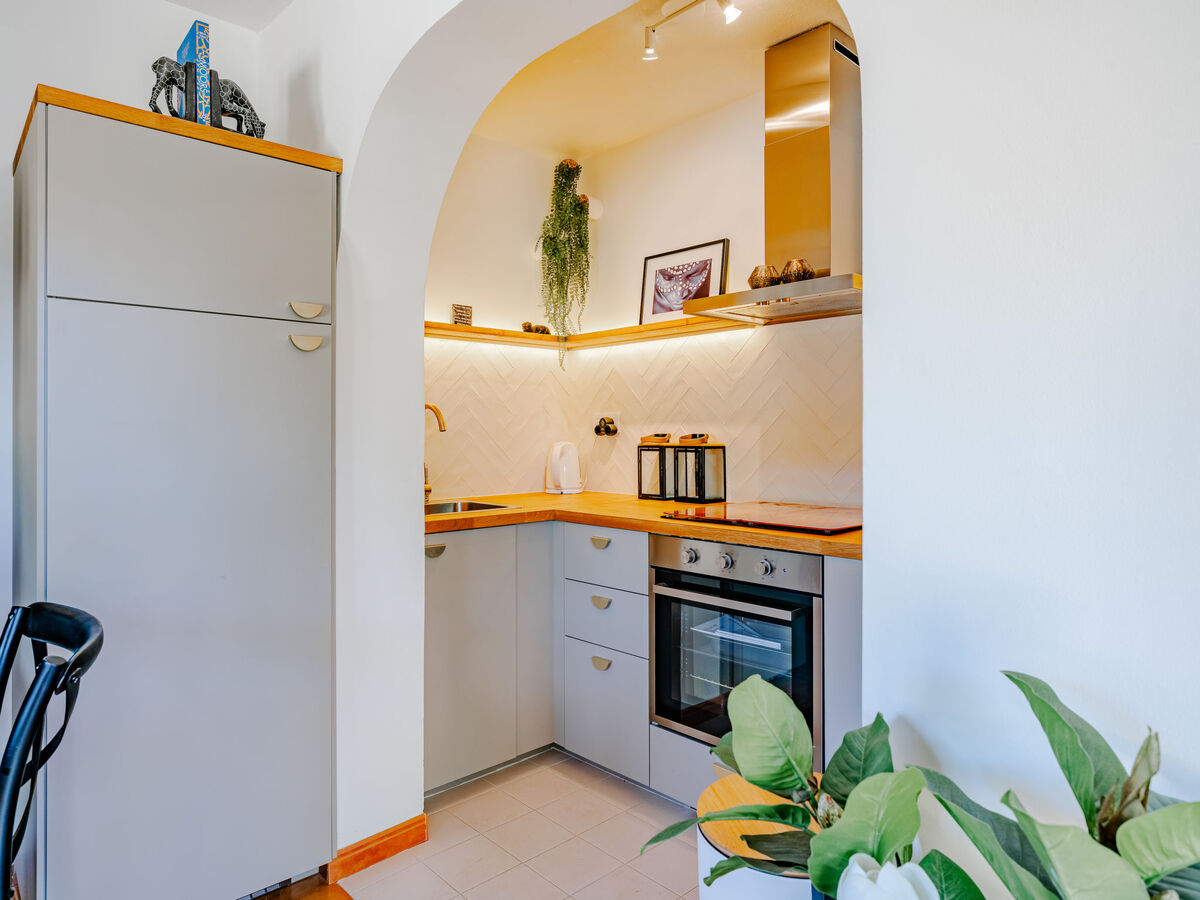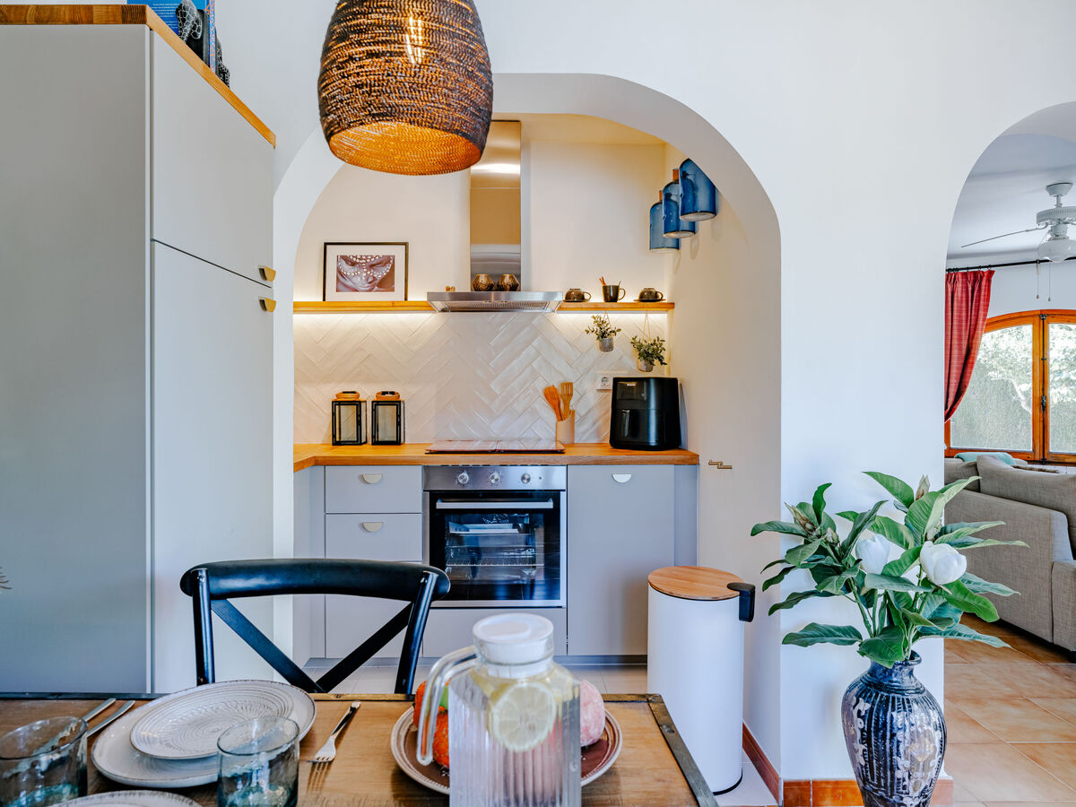 Cuisine ouverte (four, 3 plaques vitrocéramiques, grille-pain, congélateur, cafetière électrique).