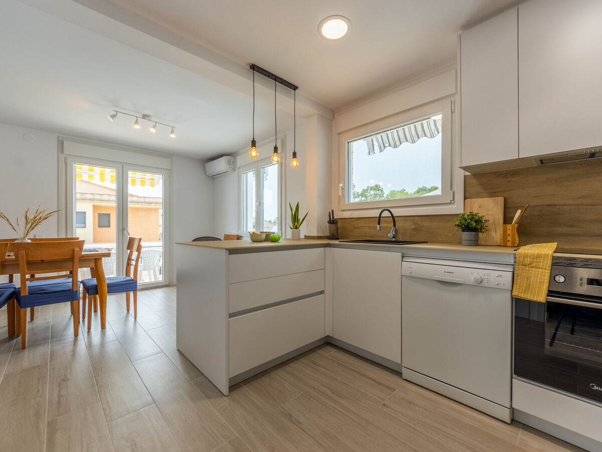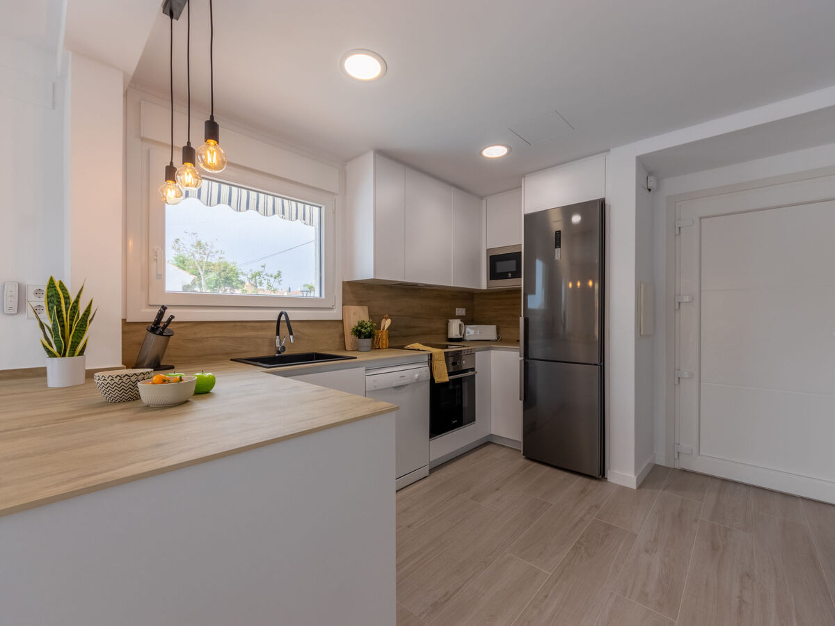Cuisine ouverte (four, lave-vaisselle, 4 plaques vitrocéramiques, grille-pain, bouilloire électrique, micro-ondes, cafetière électrique) avec bar.