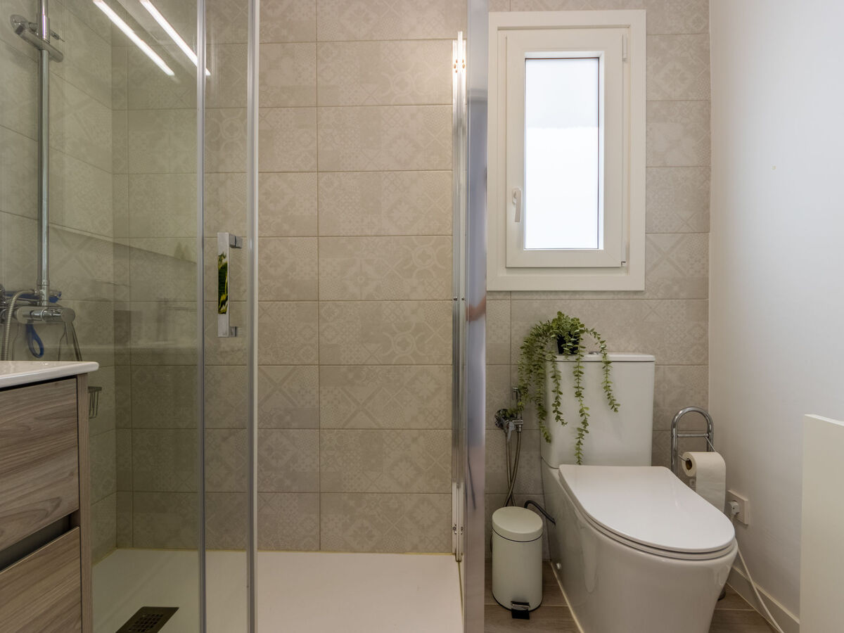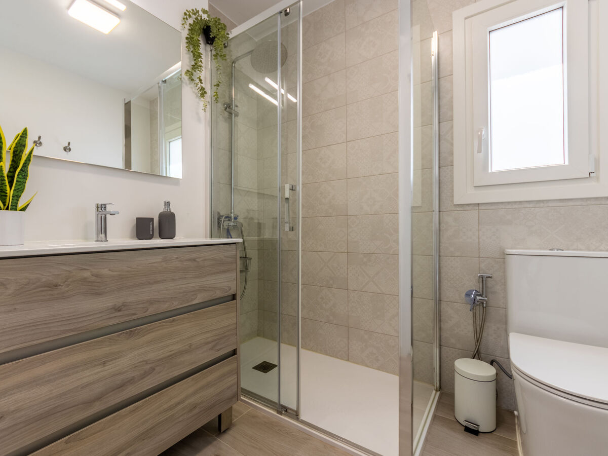 Douche extérieure, jardinet, meubles de jardin, barbecue.