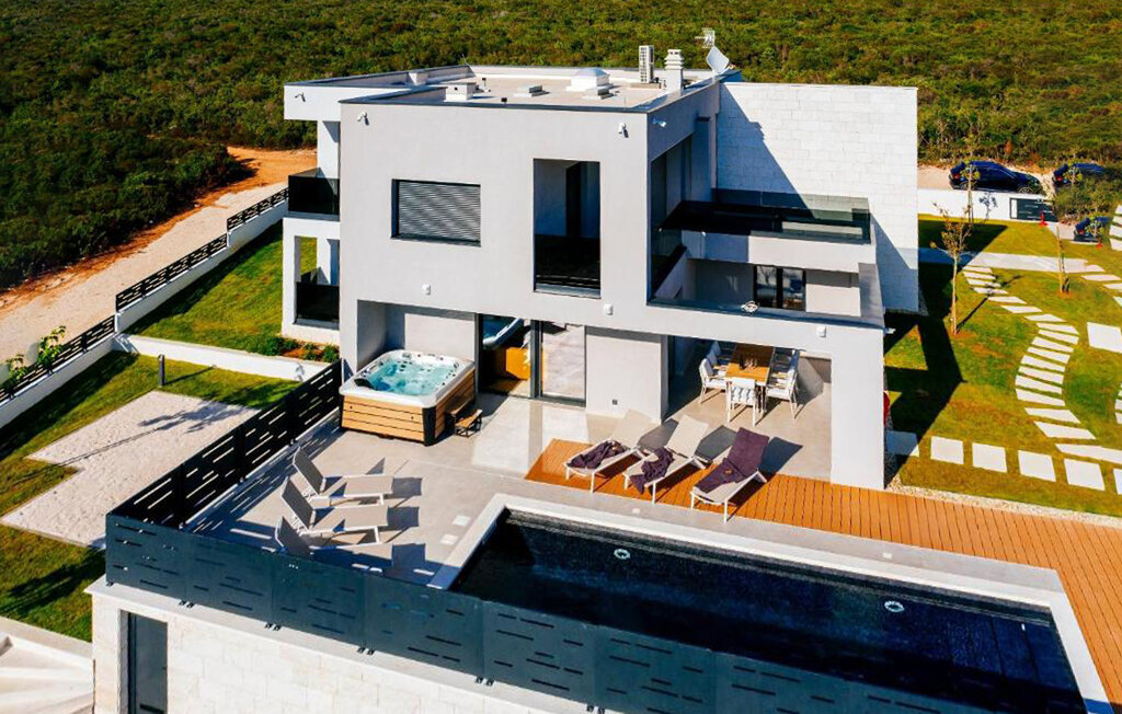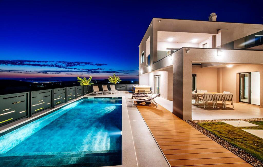Bien-être à l'extérieur : Location de vacances disposant de chaises-longues et d'un ou plusieurs équipements tels que piscine extérieure, jacuzzi extérieur, lit à baldaquin de jardin etc...