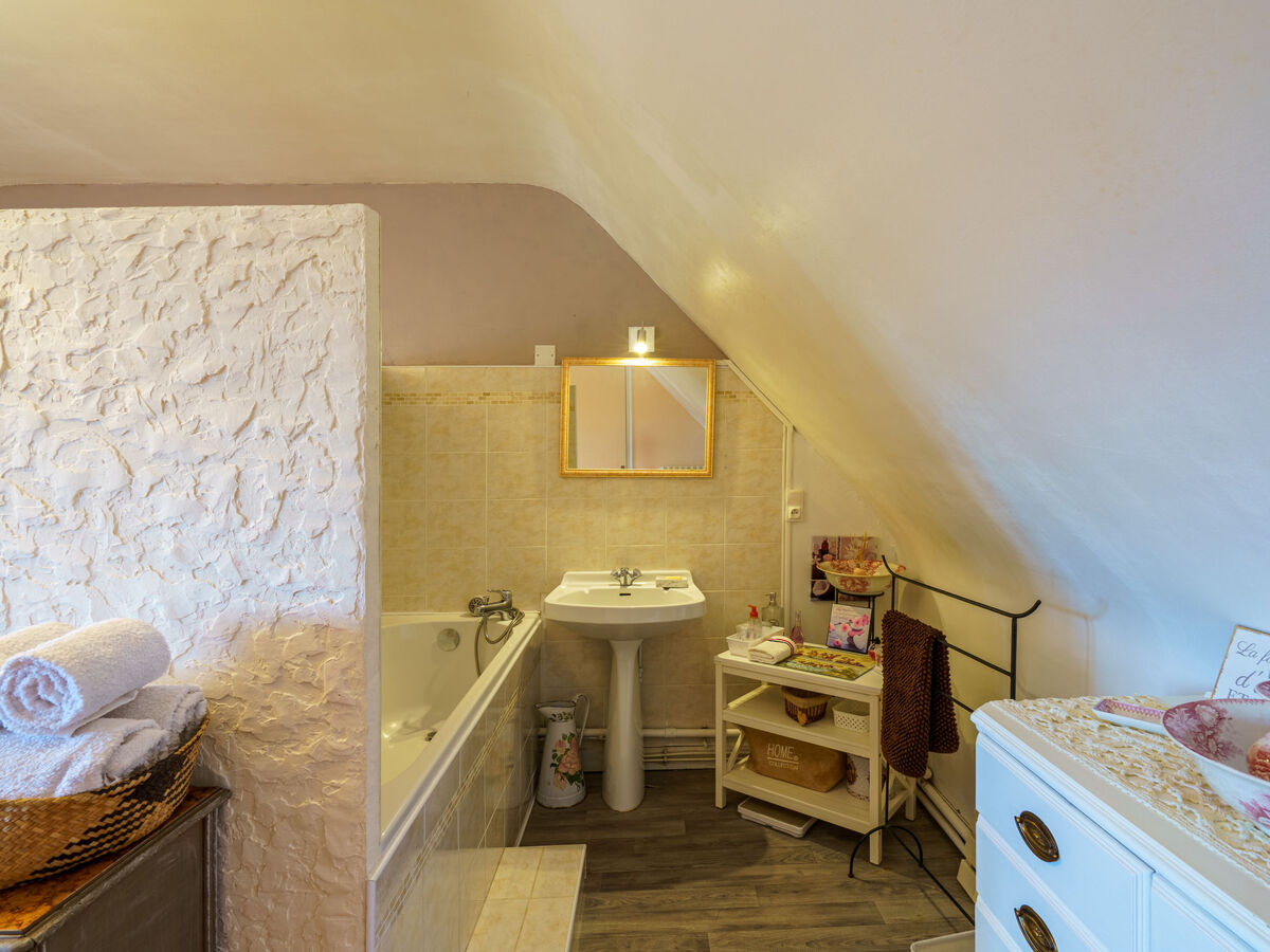 1 chambre avec 1 grand-lit (180 cm, longueur 190 cm), salle de bains et lavabo.