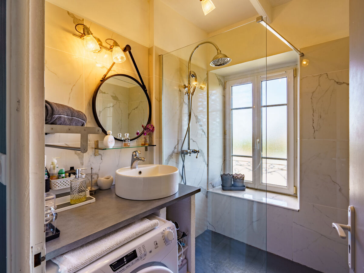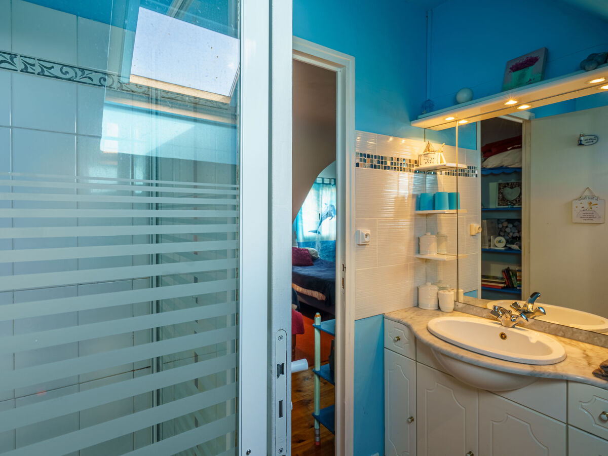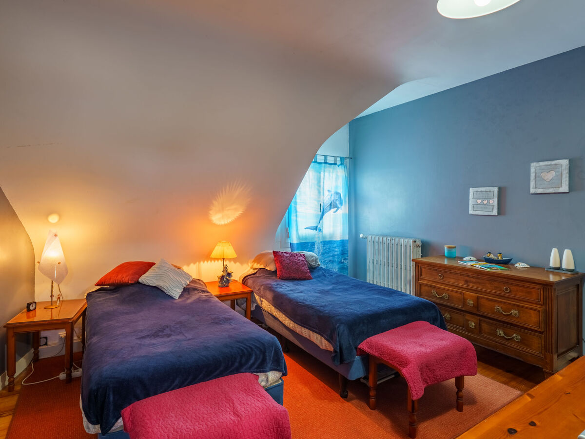 1 chambre avec 2 lits (90 cm, longueur 190 cm), 1 divan-lit (80 cm, longueur 170 cm), douche.