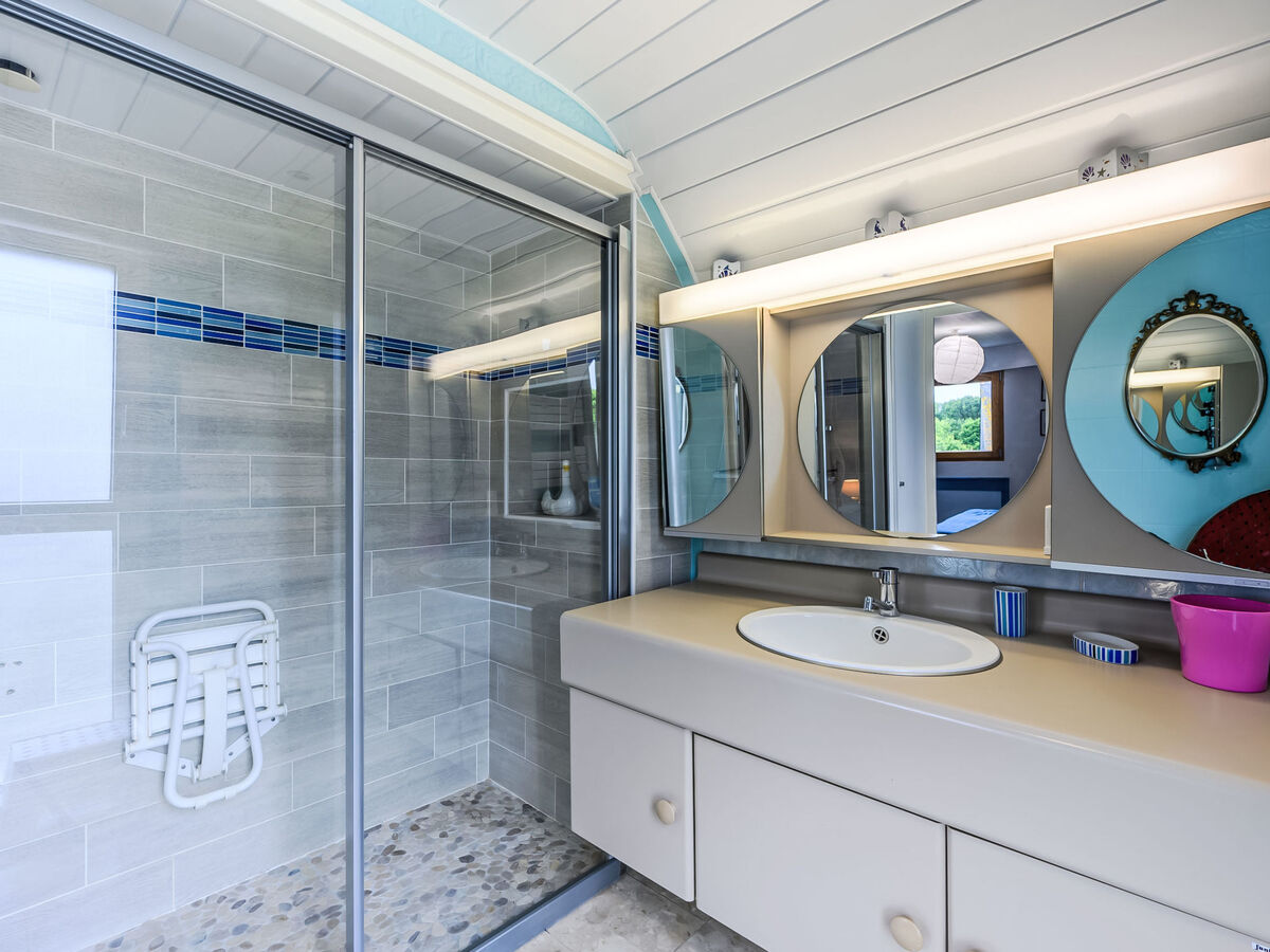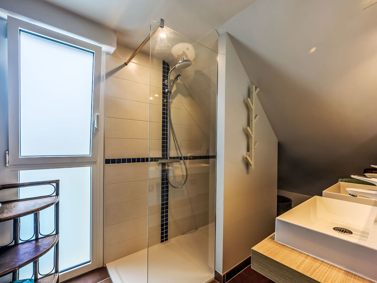 À l'étage supérieur: 1 chambre avec 2 lits (80 cm, longueur 200 cm), douche.