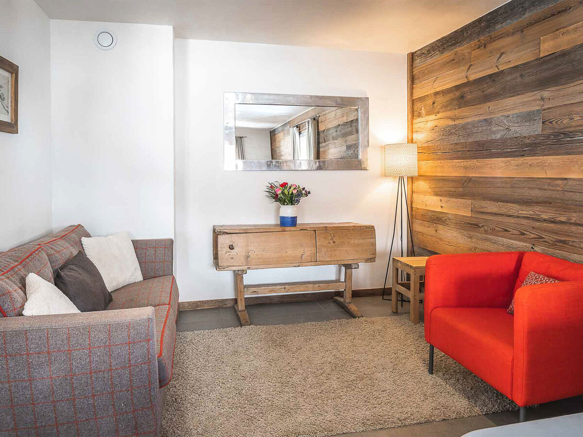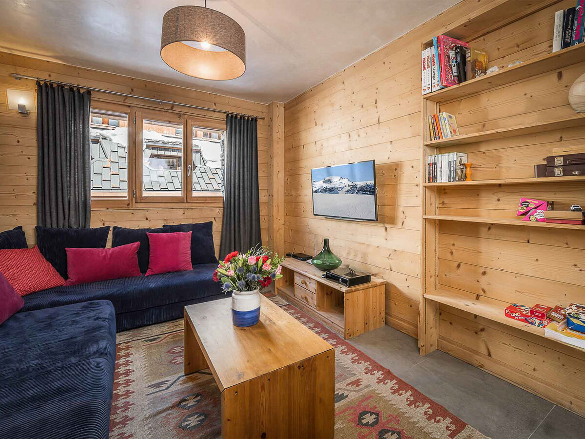2ème étage: séjour/salle à manger avec 2 divans-lits, cheminée, table pour les repas et TV (écran plat).