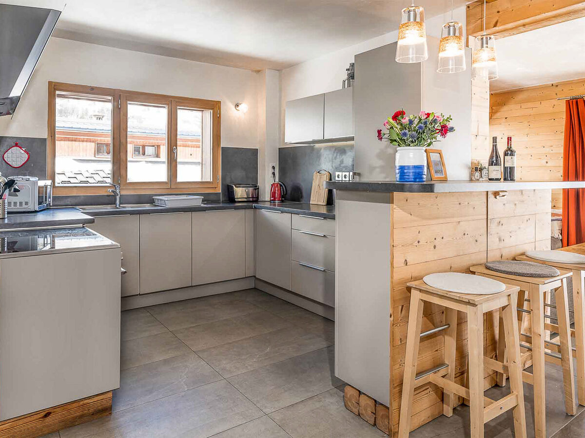 Cuisine ouverte (four, lave-vaisselle, 4 plaques vitrocéramiques, grille-pain, bouilloire électrique, congélateur, cafetière électrique, appareil à raclette).