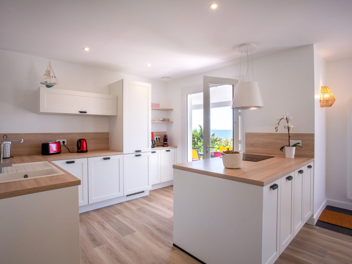 Grande cuisine ouverte (four, lave-vaisselle, 1 plaque vitrocéramiques, 4 feux, grille-pain, bouilloire électrique, congélateur, cafetière électrique, Capsules pour machine à café (Nespresso Krups) (NON INCLUSES), ilot de cuisine).