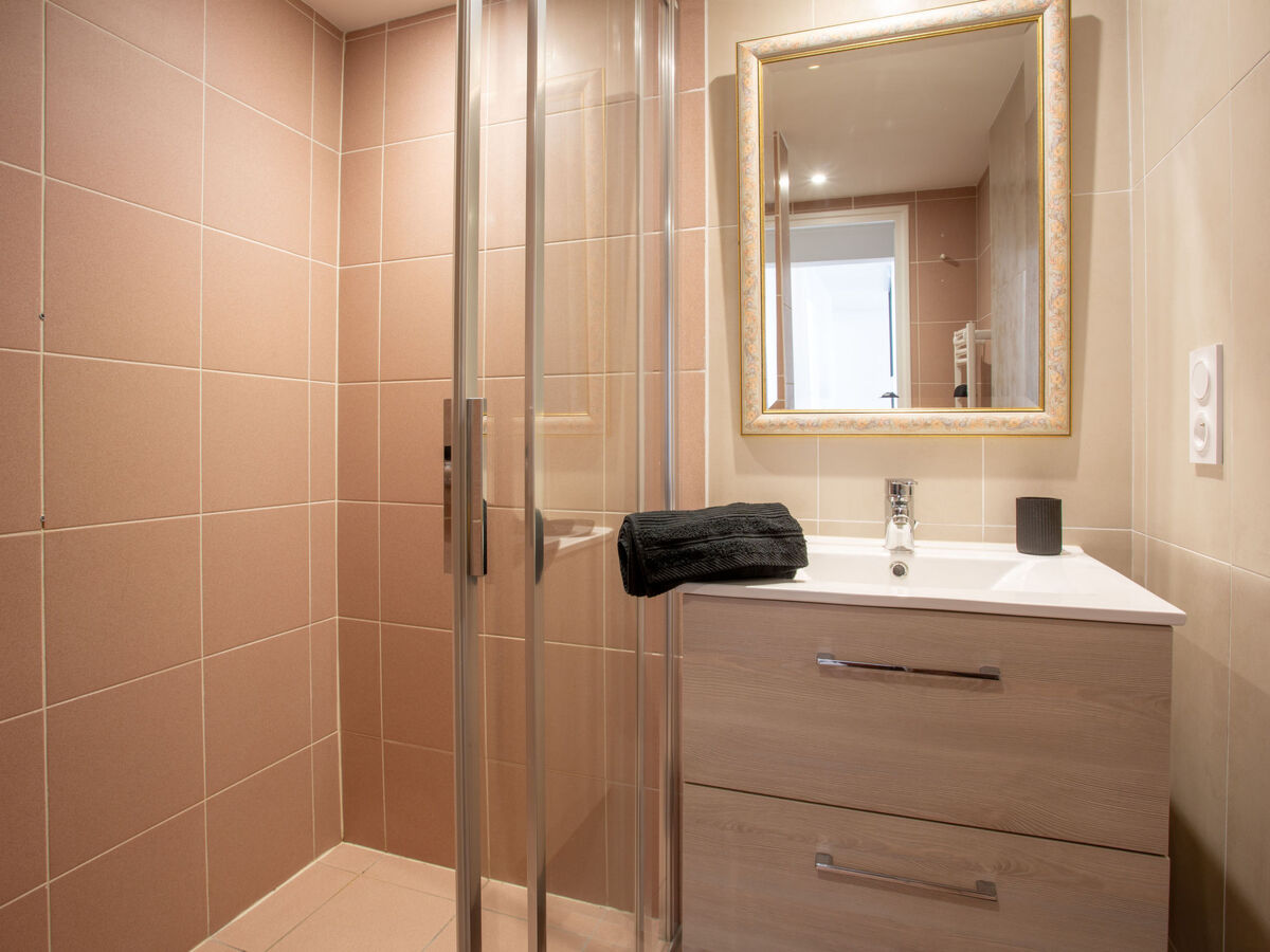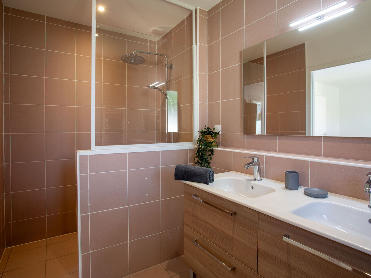 1 chambre avec 1 grand-lit (1 x 160 cm, longueur 200 cm), douche/WC et double vasque.