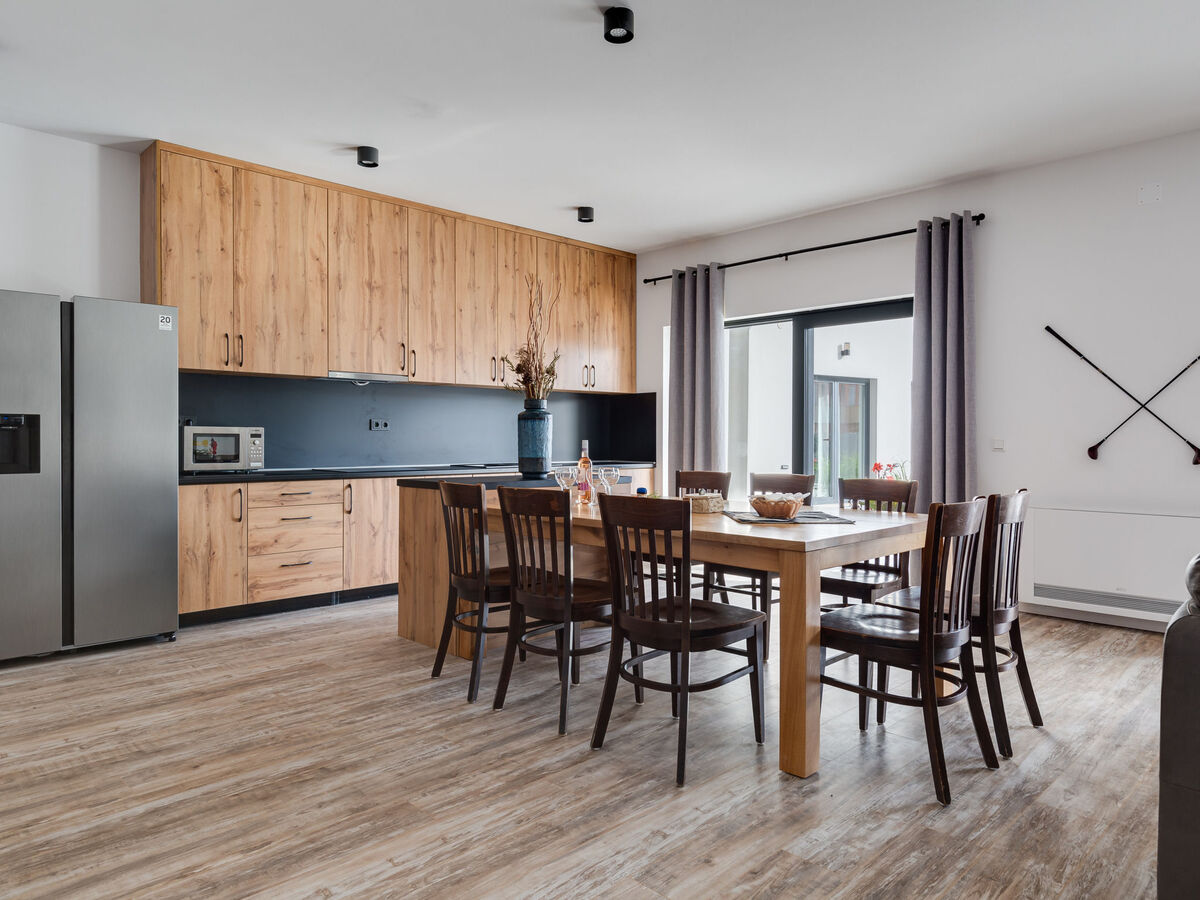 Cuisine ouverte (four, lave-vaisselle, 4 plaques vitrocéramiques, grille-pain, bouilloire électrique, micro-ondes, congélateur, cafetière électrique).
