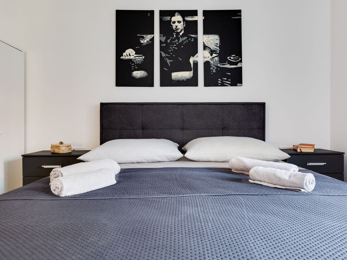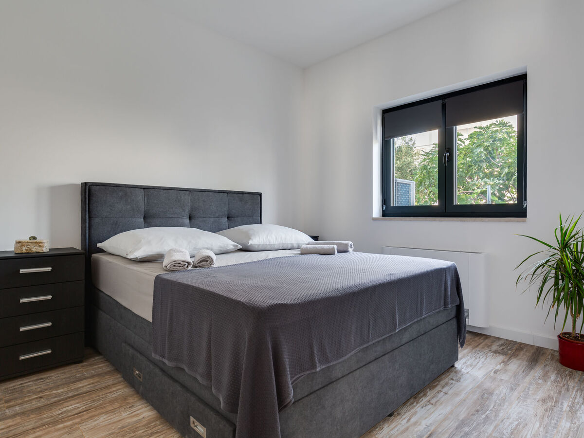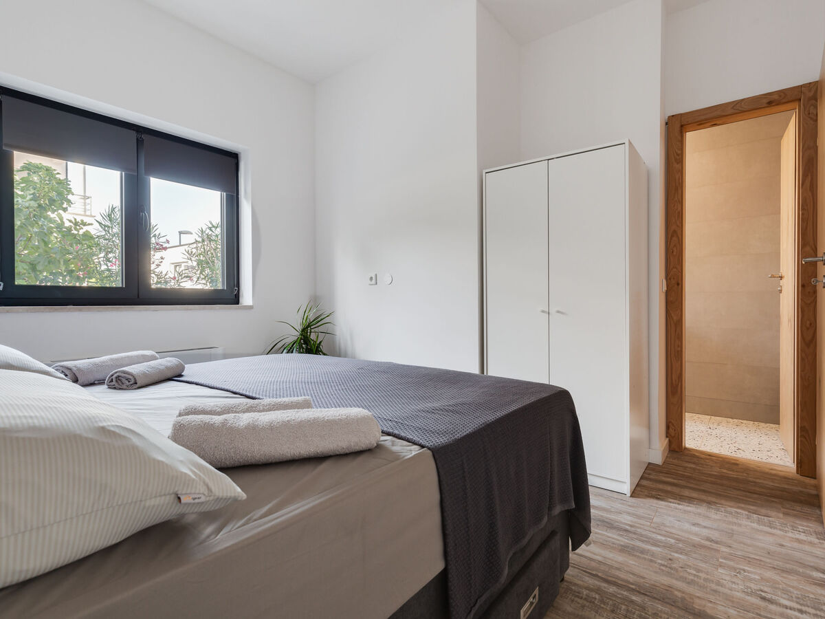 1 chambre avec 1 grand-lit (160 cm, longueur 200 cm), douche/WC et air-conditionné.