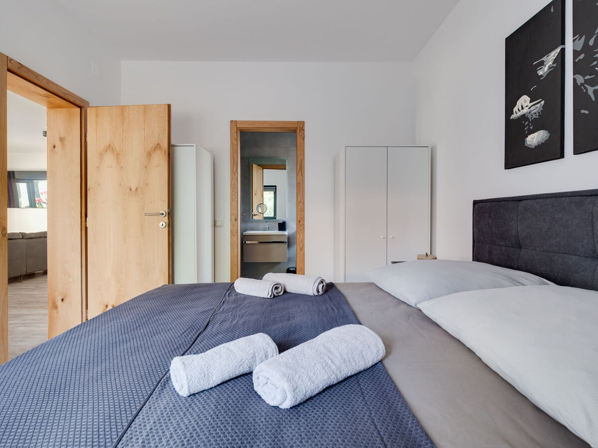 À l'étage supérieur: 2 chambres, chaque chambre avec: 1 grand-lit (160 cm, longueur 200 cm), douche/WC et air-conditionné.