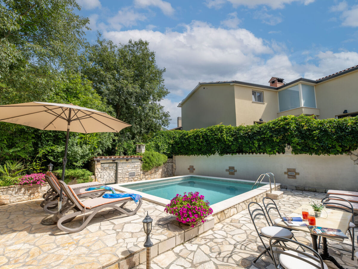 A usage privé: terrain 550 m2 (clôturé) avec plantes, piscine (5 x 5 m, profondeur 160 cm, disponibilité saisonnière: 01.Avr.