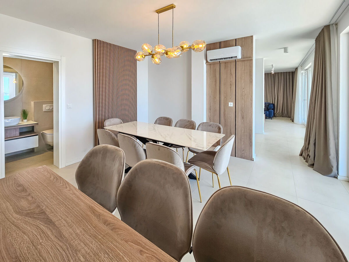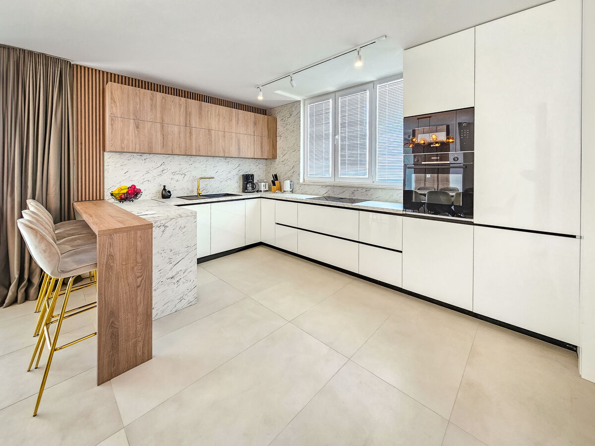 Cuisine (lave-vaisselle, 4 plaques à induction, grille-pain, bouilloire électrique, micro-ondes, congélateur, cafetière électrique) avec table pour les repas, air-conditionné.
