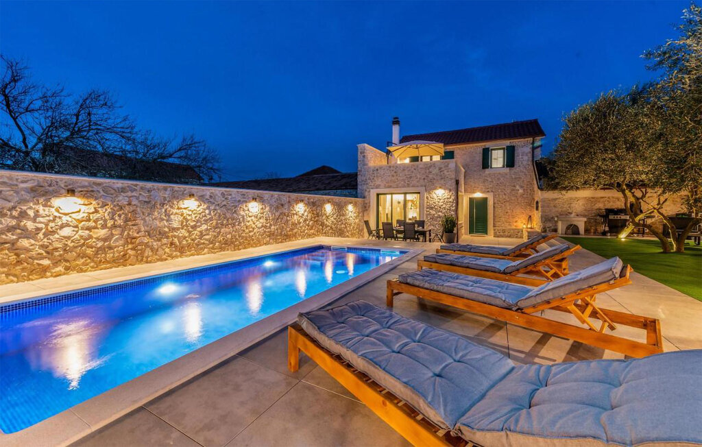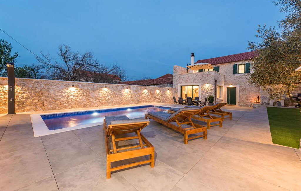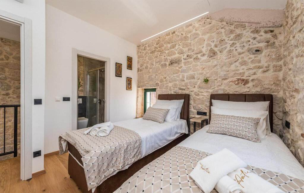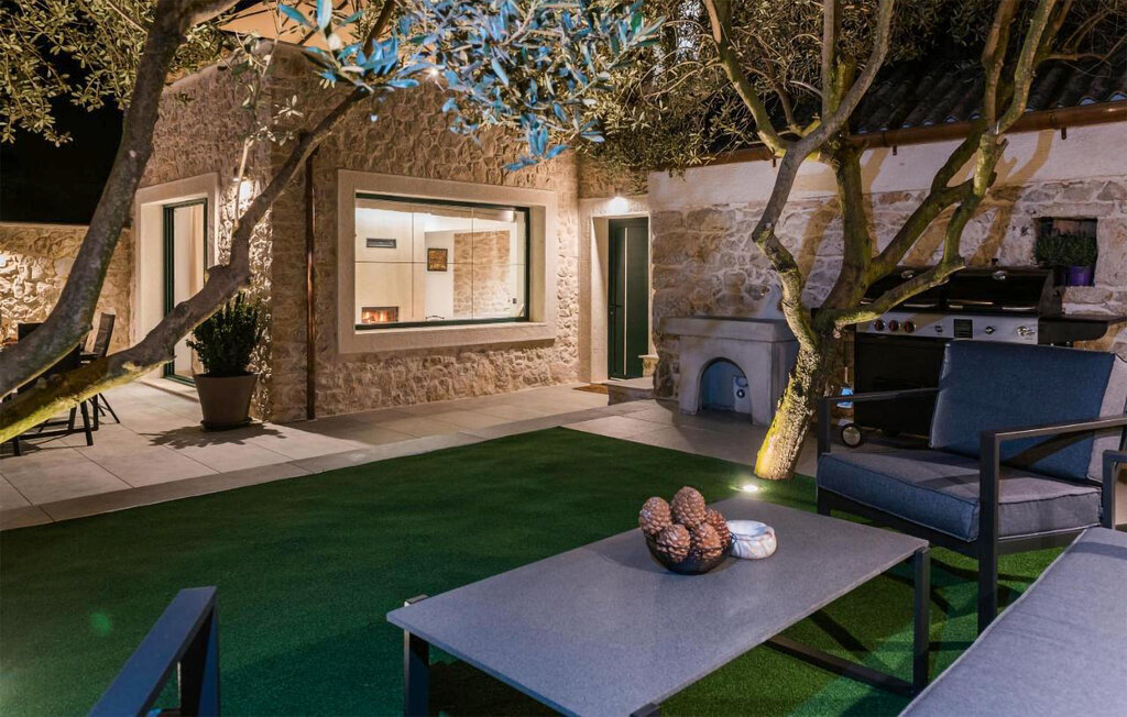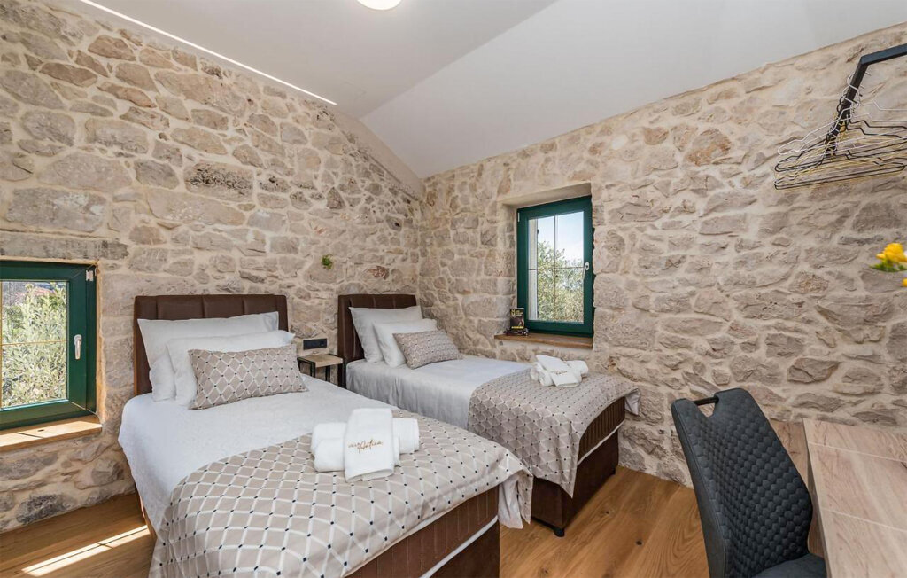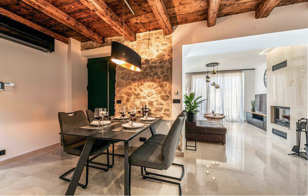 Détendez-vous dans cette charmante maison en pierre, qui reprend le style architectural traditionnel de la Croatie et le combine avec des éléments modernes, et profitez d'une atmosphère de vacances harmonieuse. L'aménagement élégant, combiné à des accents rustiques et à une cheminée confortable, crée un foyer accueillant où chaque détail a été conçu avec soin.