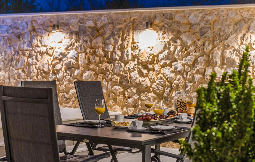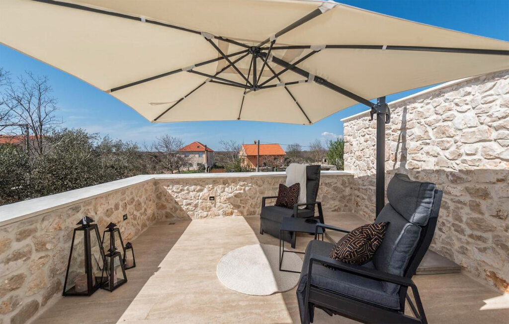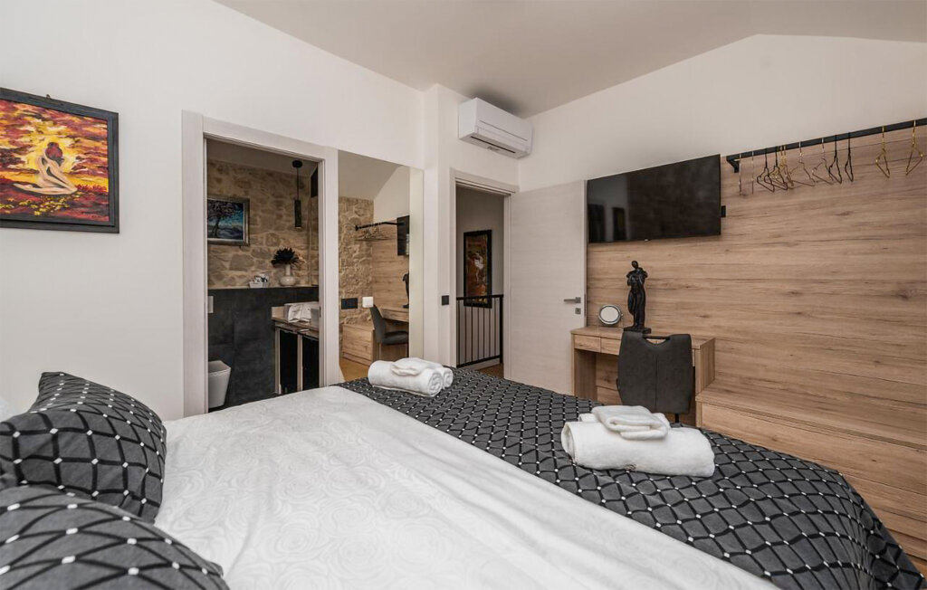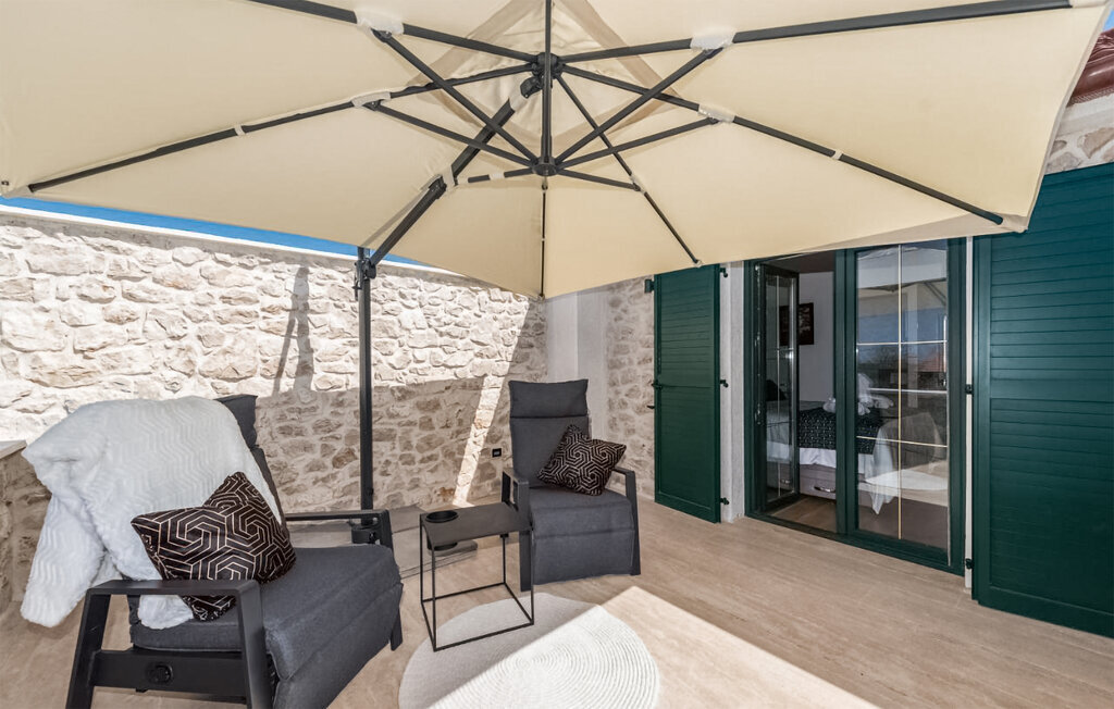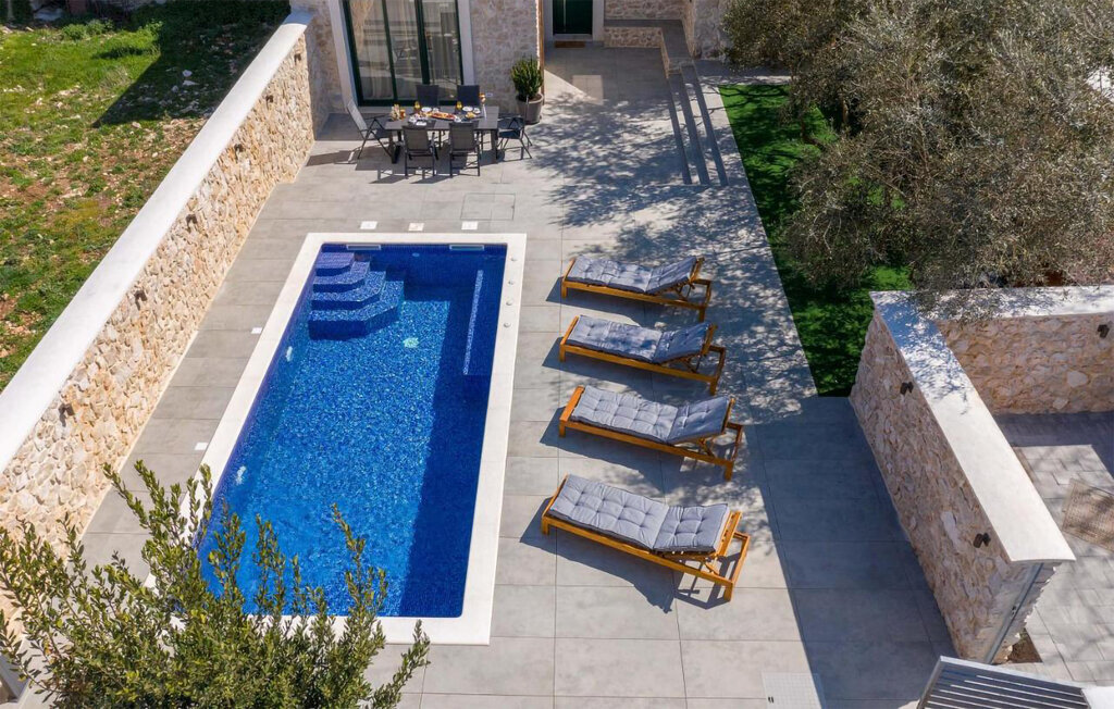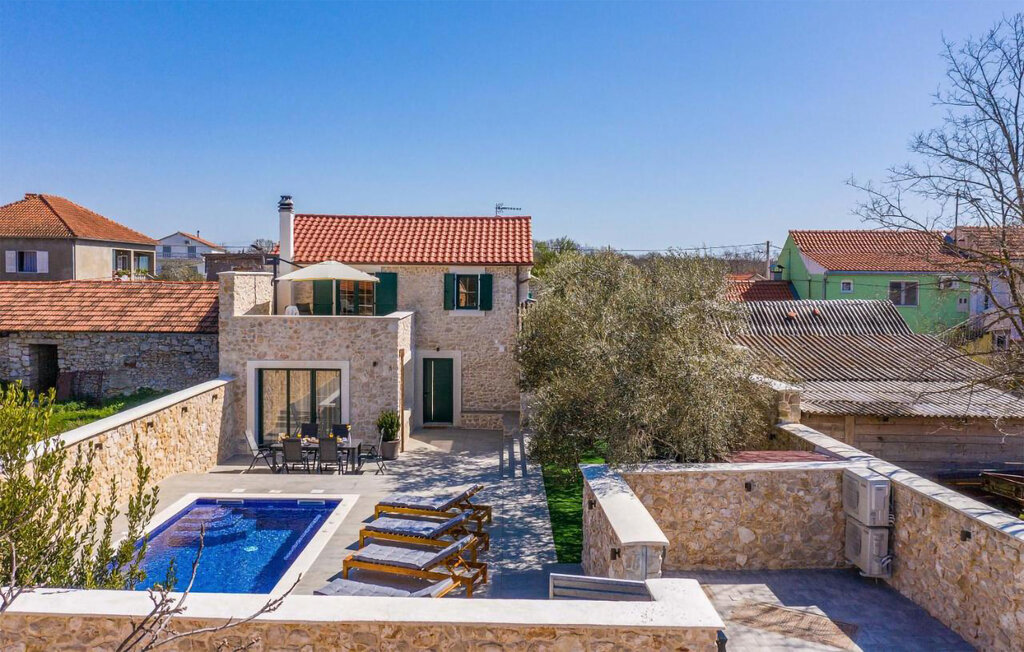 Détendez-vous dans cette charmante maison en pierre, qui reprend le style architectural traditionnel de la Croatie et le combine avec des éléments modernes, et profitez d'une atmosphère de vacances harmonieuse. L'aménagement élégant, combiné à des accents rustiques et à une cheminée confortable, crée un foyer accueillant où chaque détail a été conçu avec soin.