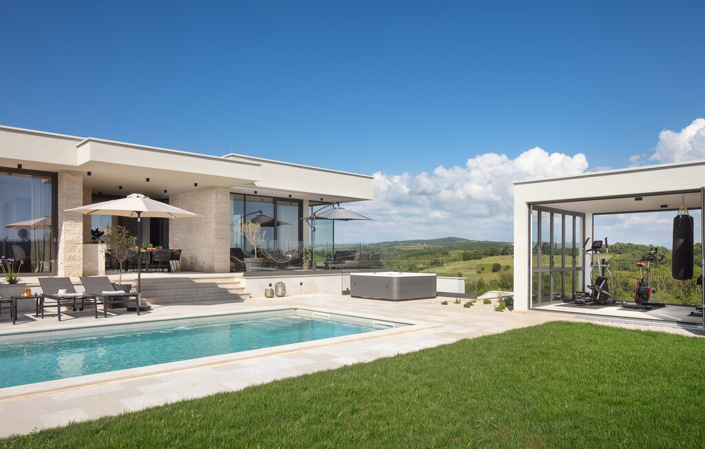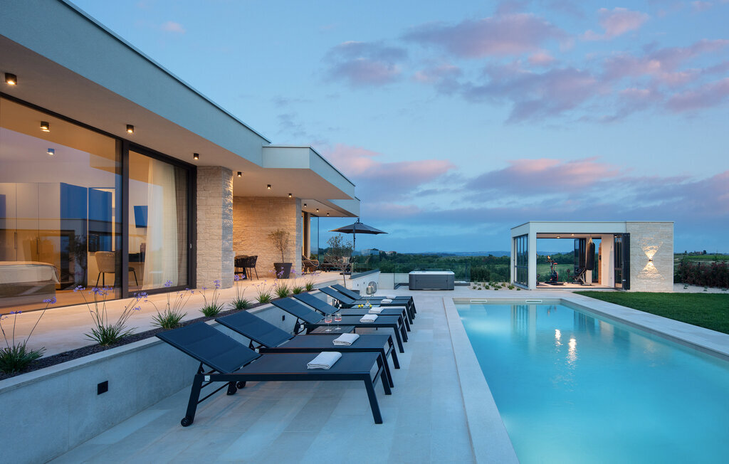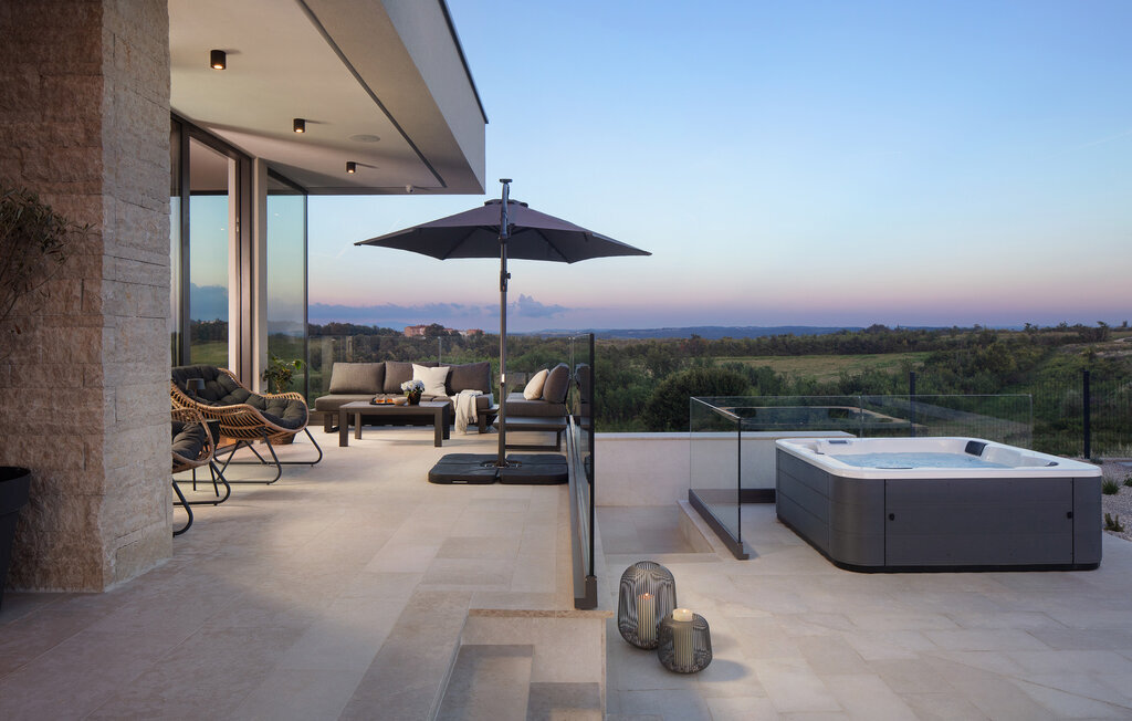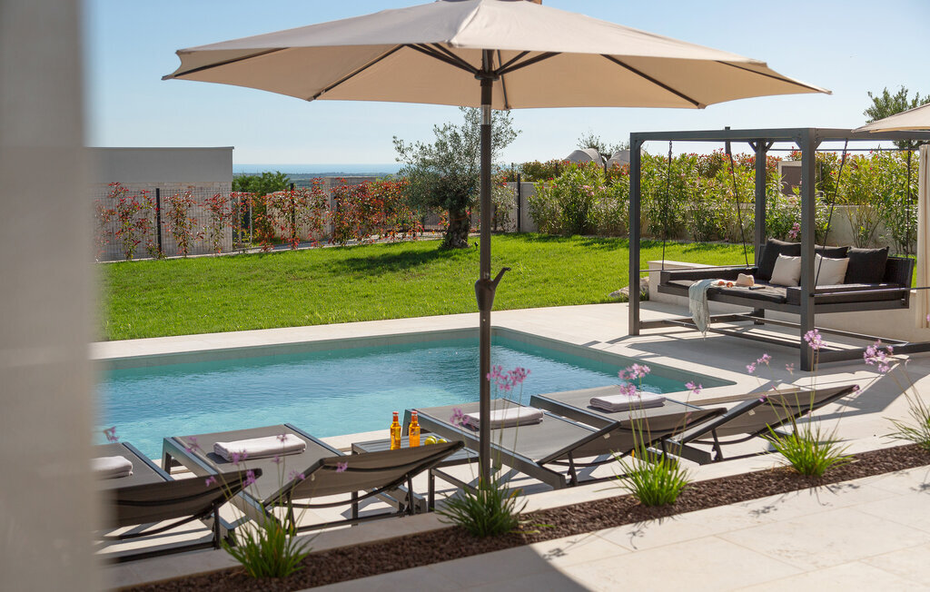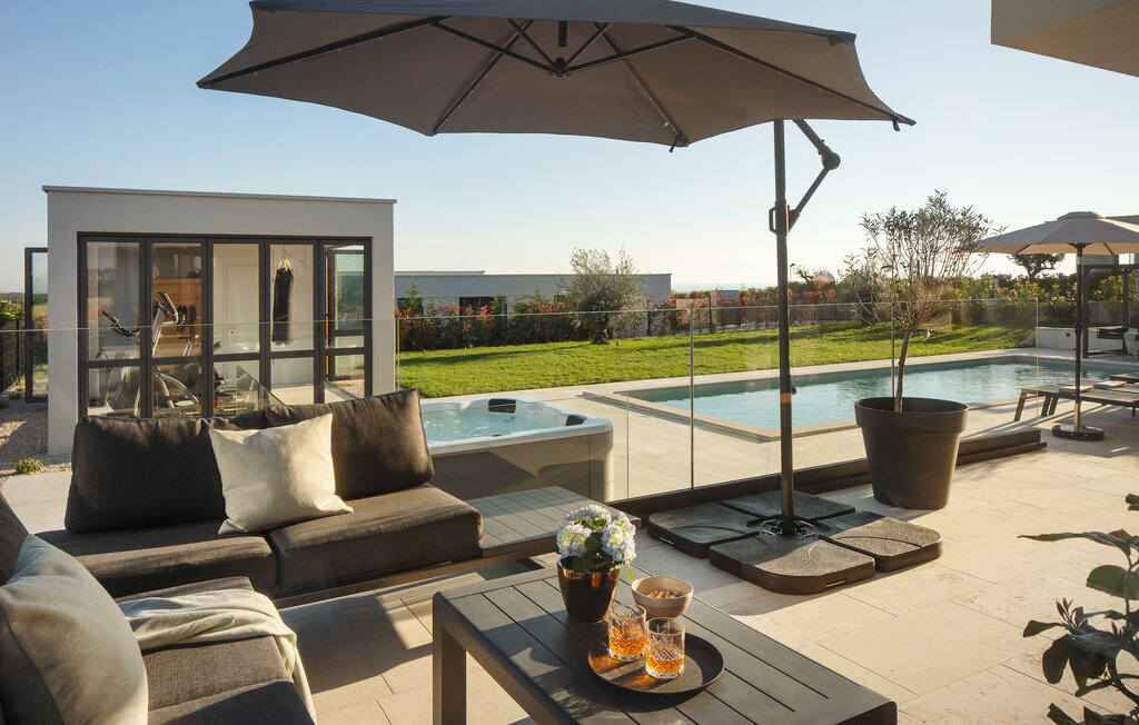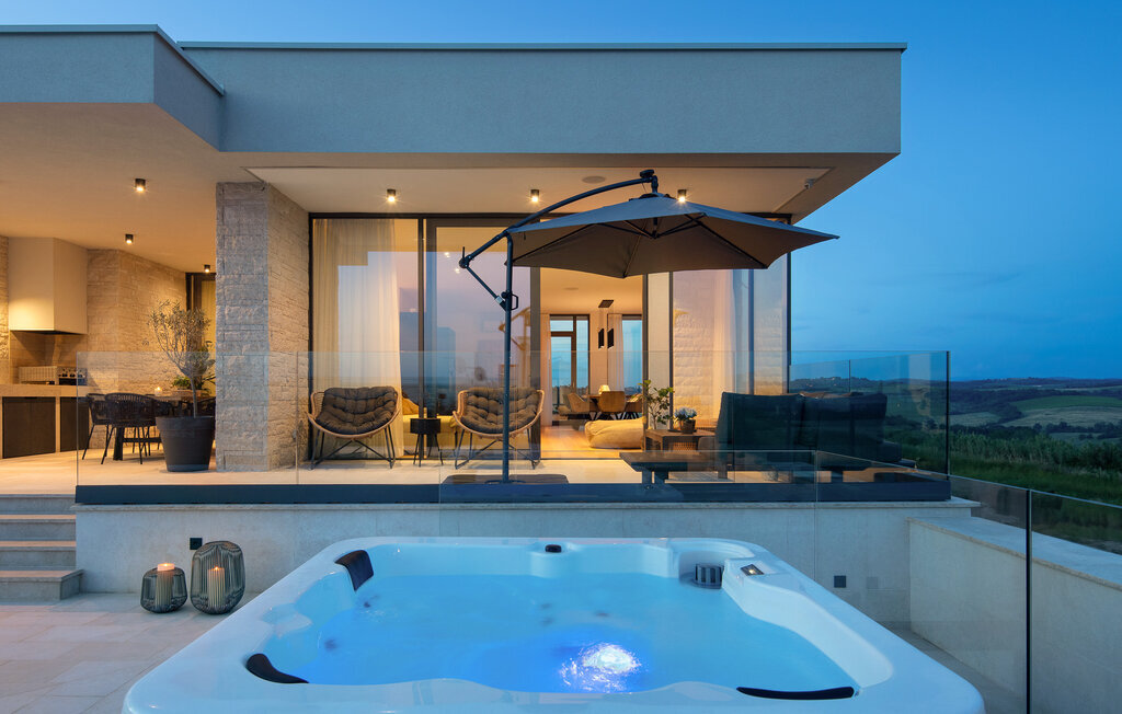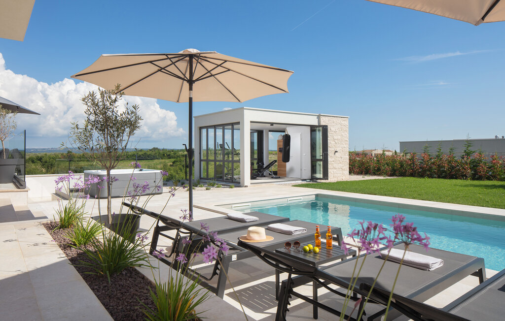 Bien-être à l'extérieur : Location de vacances disposant de chaises-longues et d'un ou plusieurs équipements tels que piscine extérieure, jacuzzi extérieur, lit à baldaquin de jardin etc...