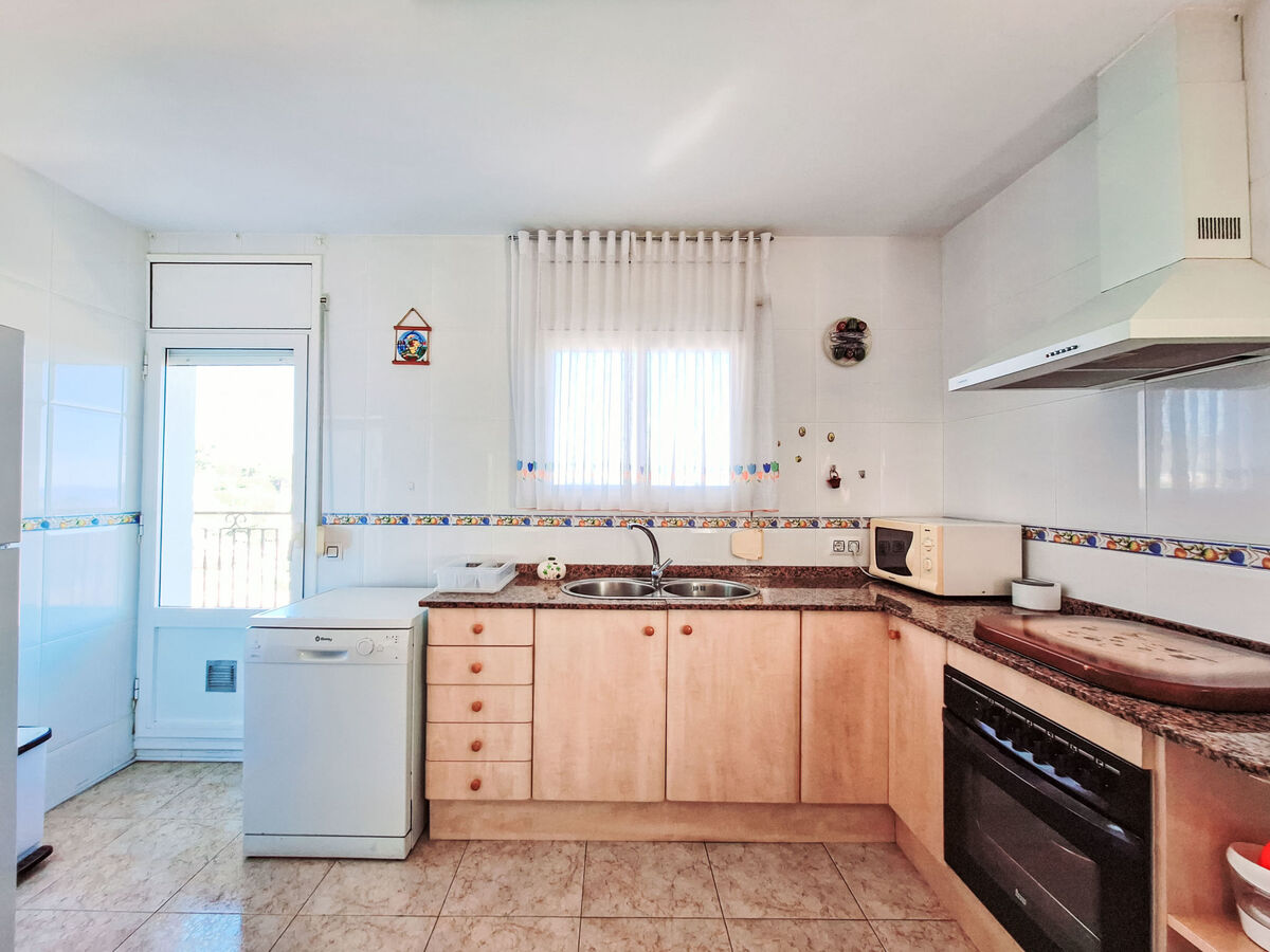 Cuisine ouverte (4 plaques de cuisson, four, lave-vaisselle, grille-pain, bouilloire électrique, micro-ondes, congélateur, cafetière électrique) avec bar.