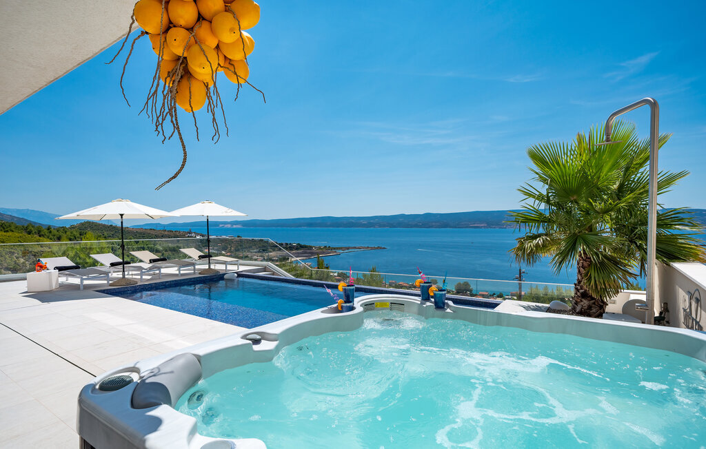 Bien-être à l'extérieur : Location de vacances disposant de chaises-longues et d'un ou plusieurs équipements tels que piscine extérieure, jacuzzi extérieur, lit à baldaquin de jardin etc...