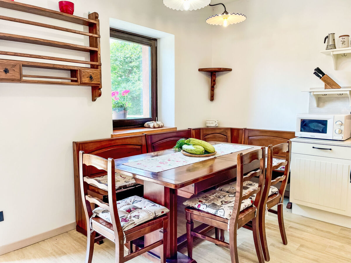 Aménagement confortable et rustique: séjour/salle à manger avec table pour les repas, coin repas et TV.