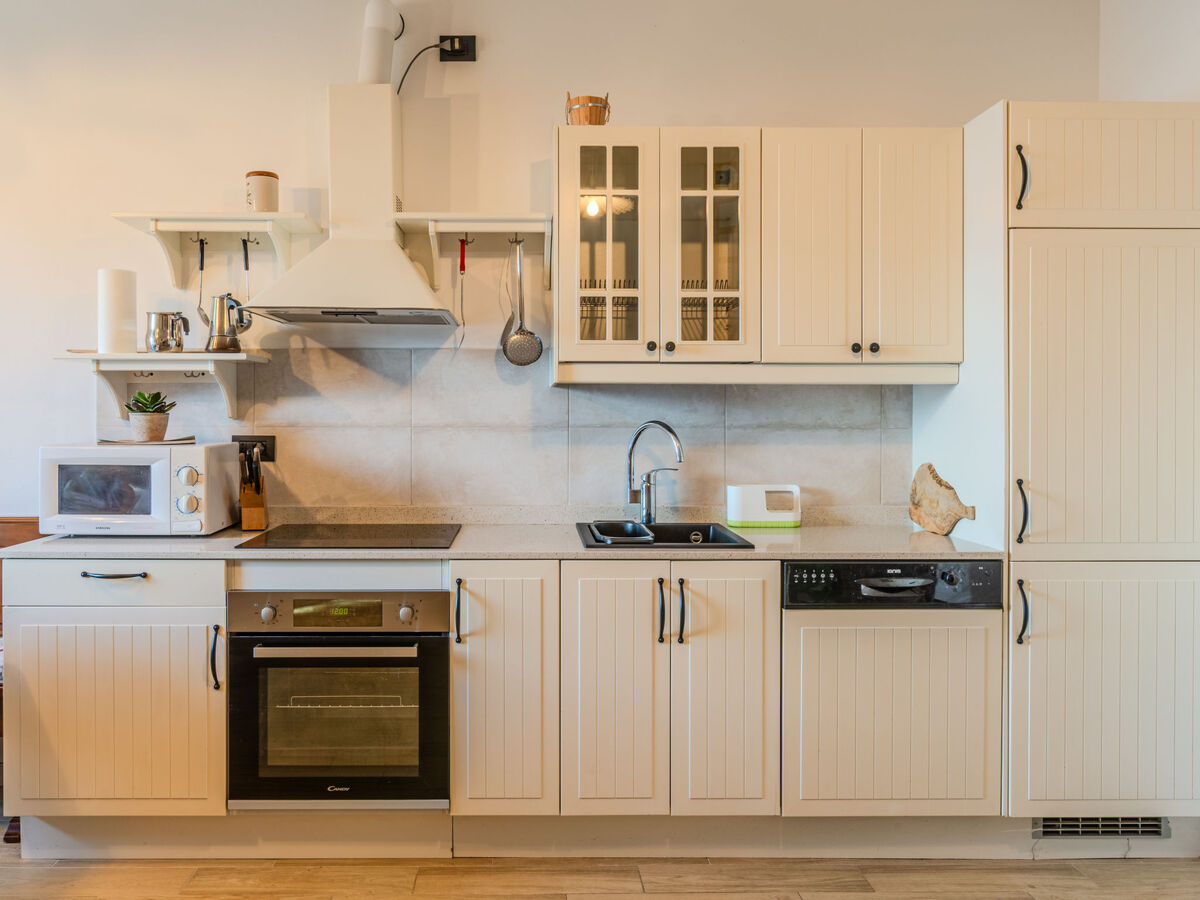 Cuisine ouverte (four, lave-vaisselle, 4 plaques à induction, micro-ondes, congélateur, cafetière électrique).