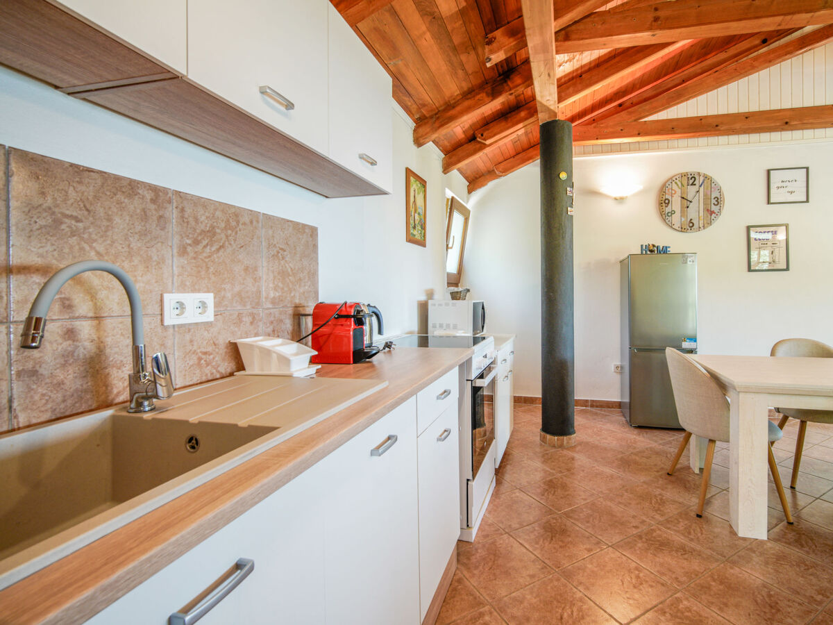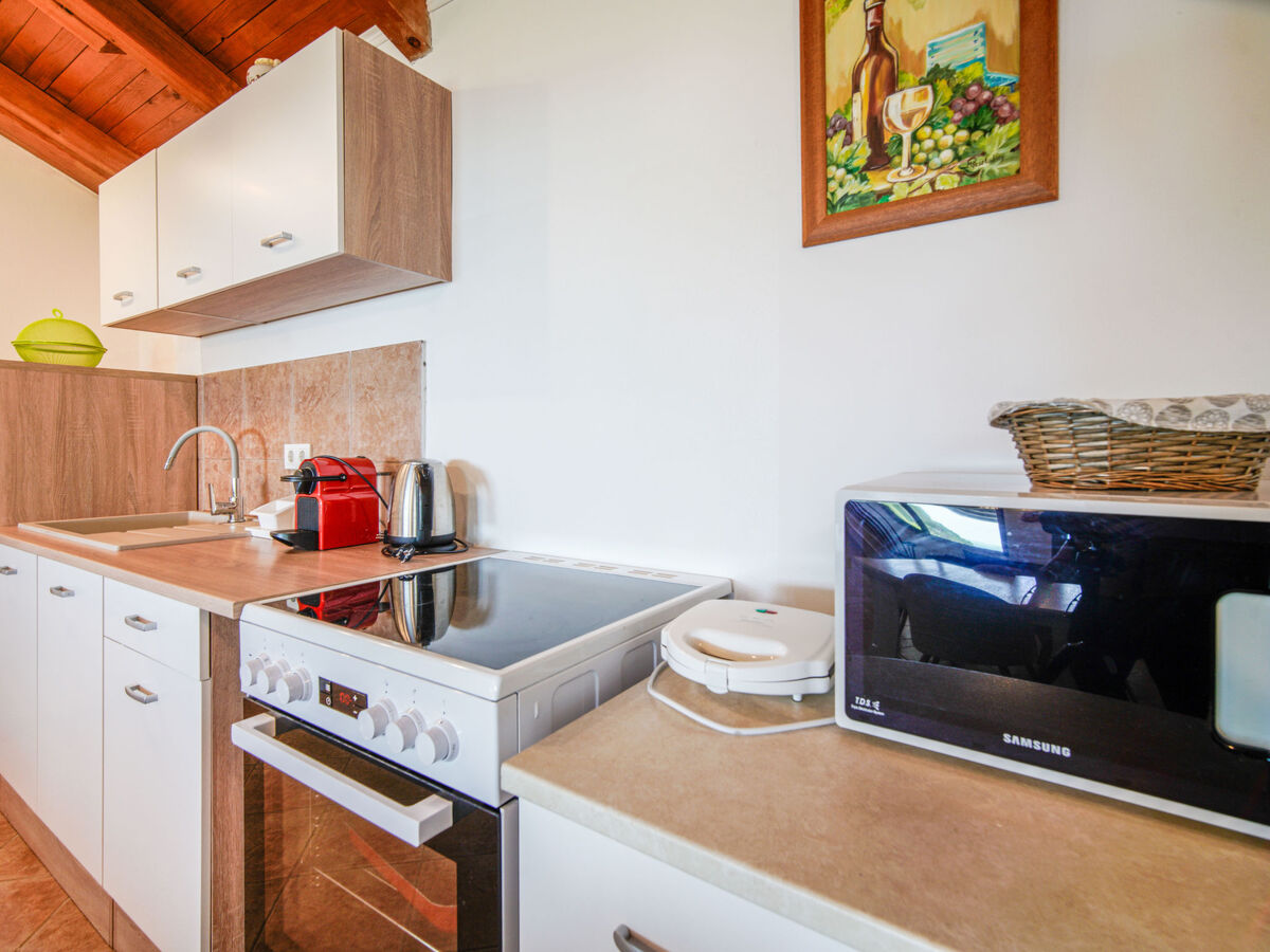 Cuisine ouverte (four, 4 plaques vitrocéramiques, bouilloire électrique, micro-ondes, congélateur, cafetière électrique).
