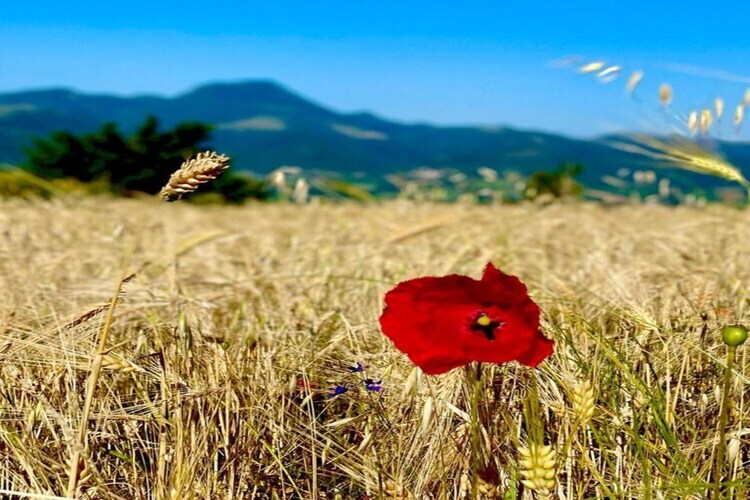 Cette maison de campagne est située dans les collines de la région des Marches, au milieu de champs dorés et de petits villages riches en histoire.