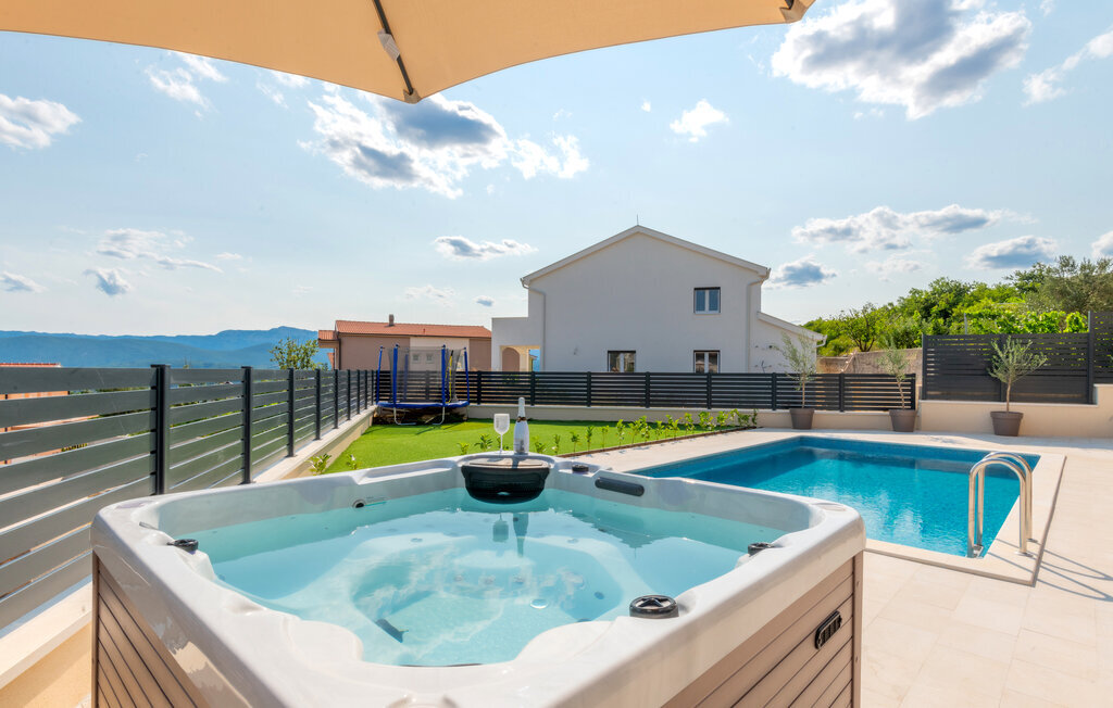 Bien-être à l'extérieur : Location de vacances disposant de chaises-longues et d'un ou plusieurs équipements tels que piscine extérieure, jacuzzi extérieur, lit à baldaquin de jardin etc...
