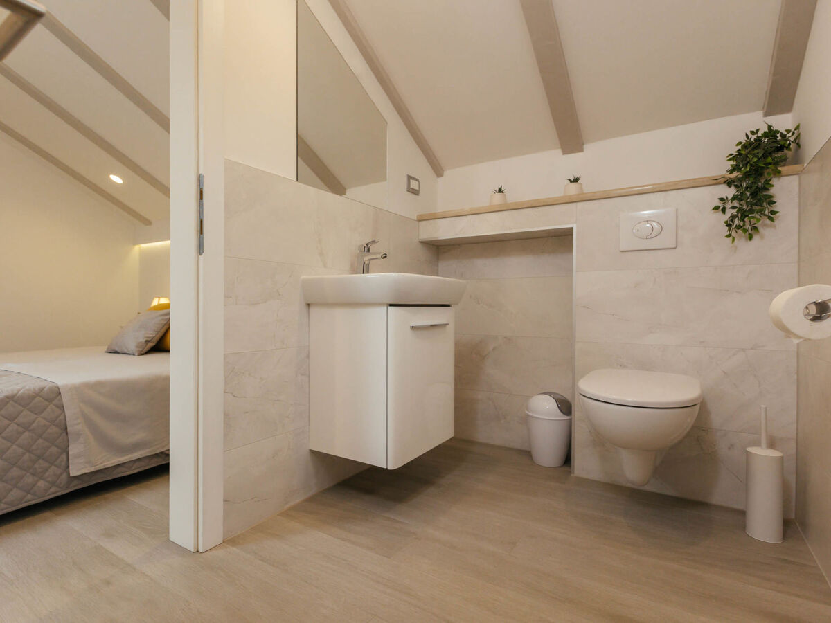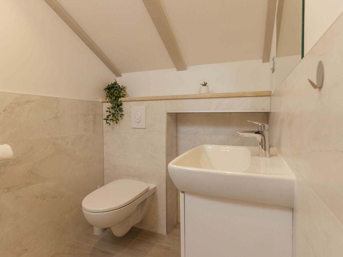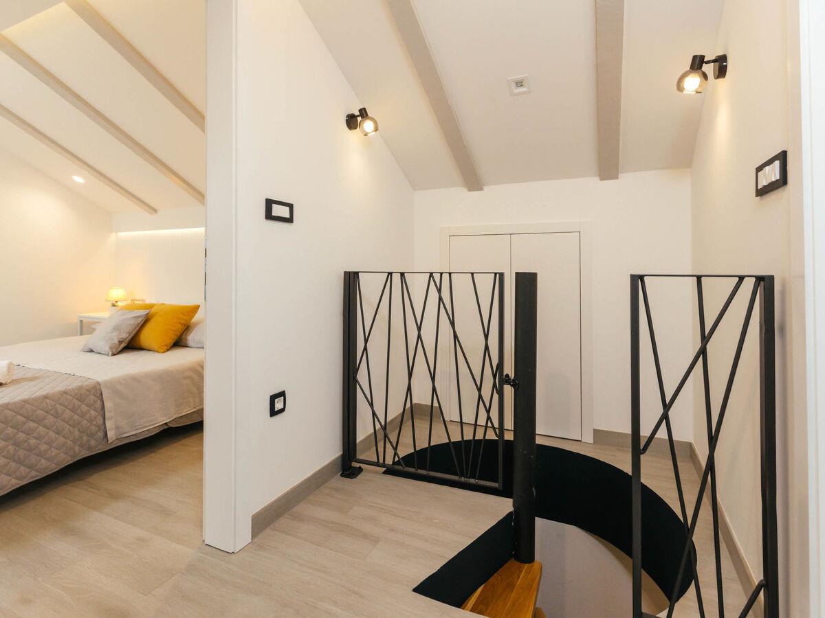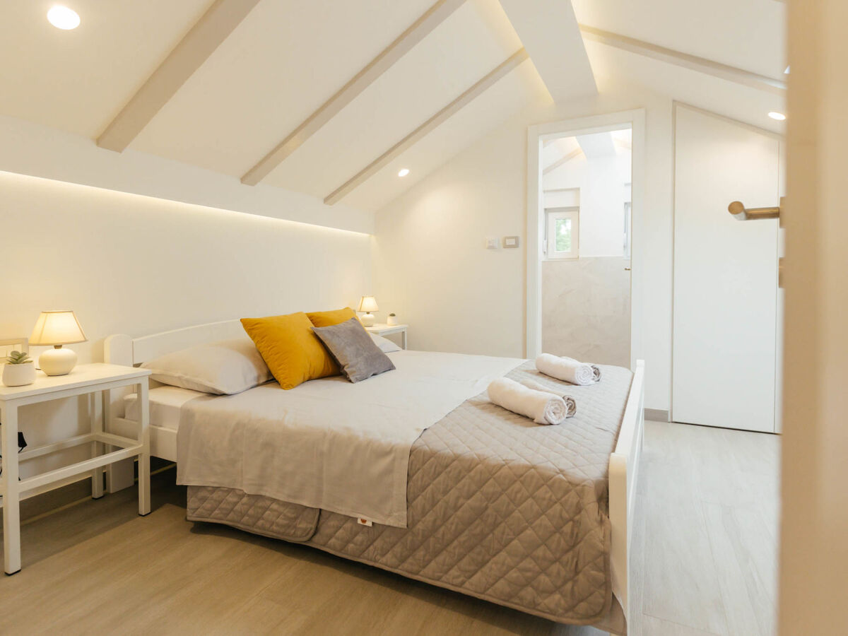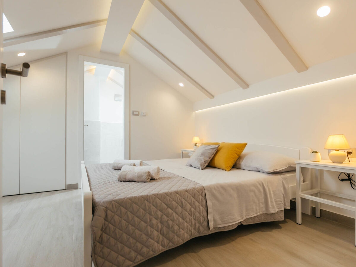À l'étage supérieur: 2 chambres, hauteur plafond 150 - 230 cm, chaque chambre avec: 1 grand-lit (160 cm, longueur 200 cm), TV (satellite) (écran plat), air-conditionné.