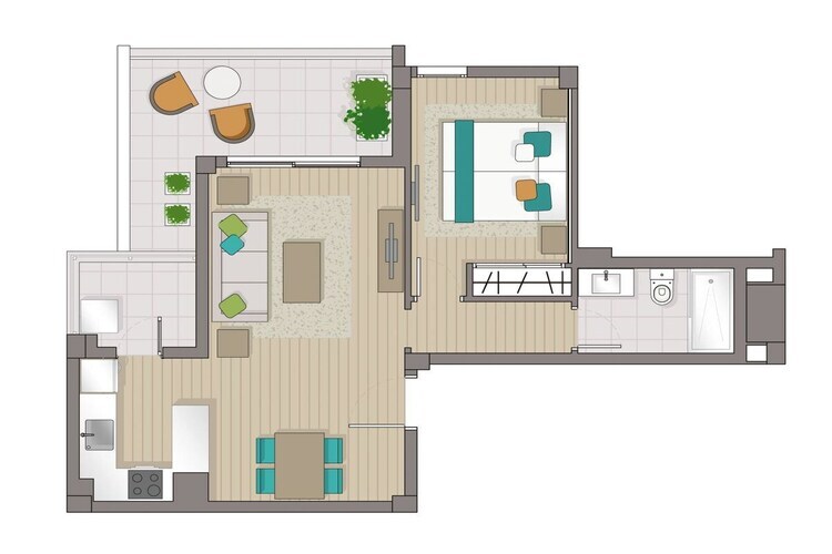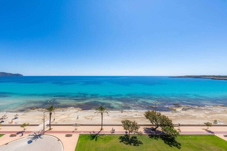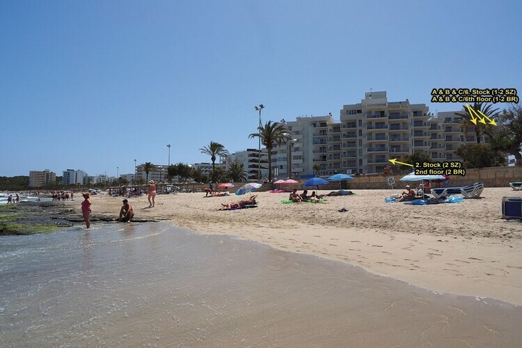 L'appartement de 64 m² au 6ème étage (ascenseur disponible) avec vue sur la mer depuis toutes les fenêtres offre une chambre, une salle de bain avec douche, un grand coin salon / salle à manger / cuisine et une salle de stockage. Le balcon couvert de 11 m² regarde vers l'est vers la baie de Cala Millor, mais libère également la vue des montagnes à l'ouest à l'arrière.