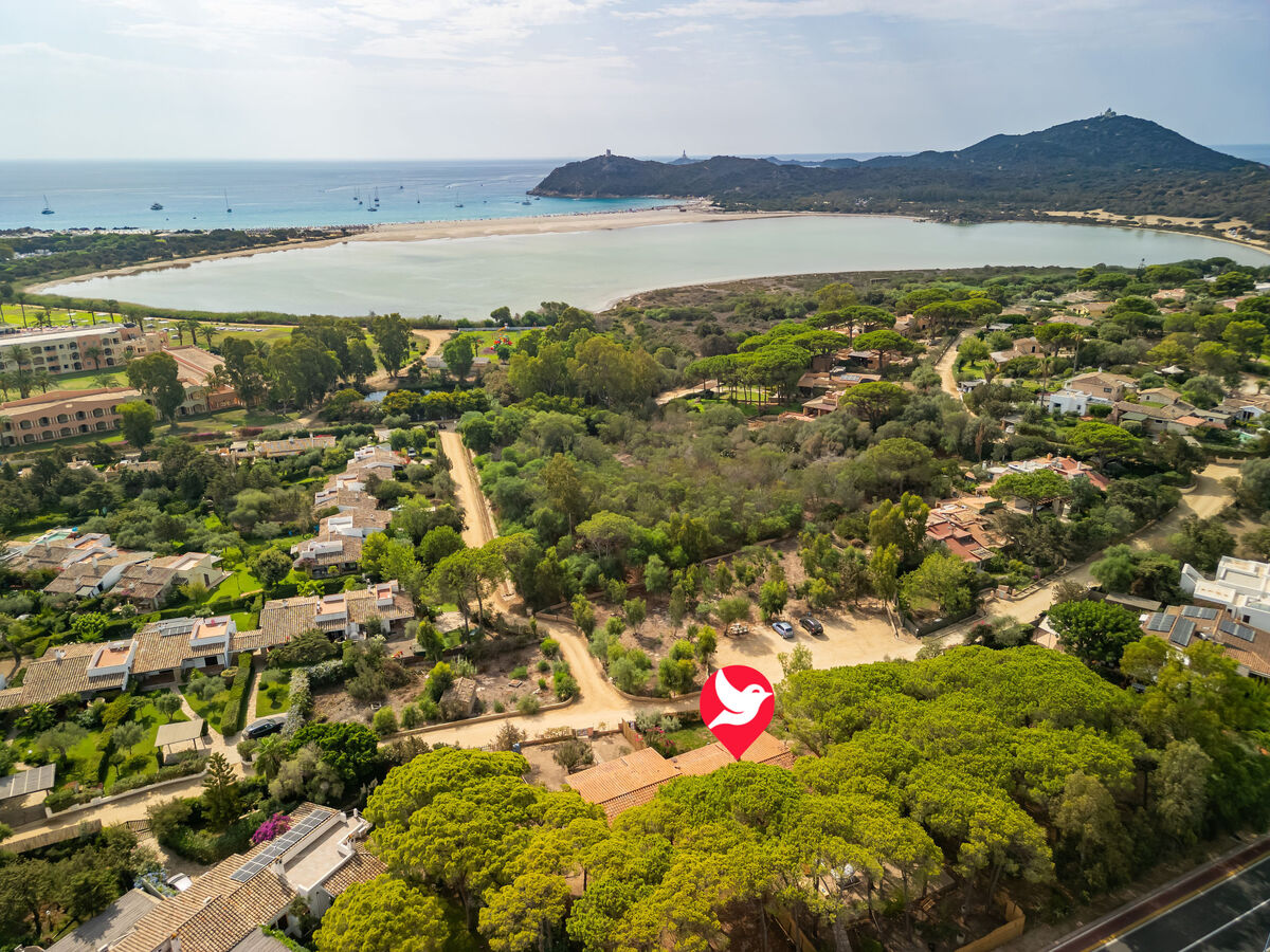 En bordure de la localité, à 1 km du centre de Villasimius, situation tranquille, ensoleillée, à 200 m de la mer, à 200 m de la plage, dans la verdure.