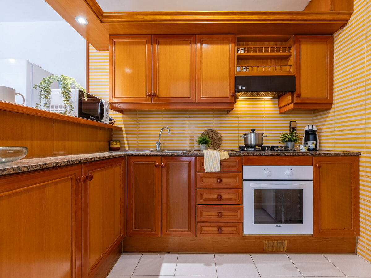 Cuisine ouverte (4 plaques de cuisson, four, grille-pain, bouilloire électrique, micro-ondes, cafetière électrique).