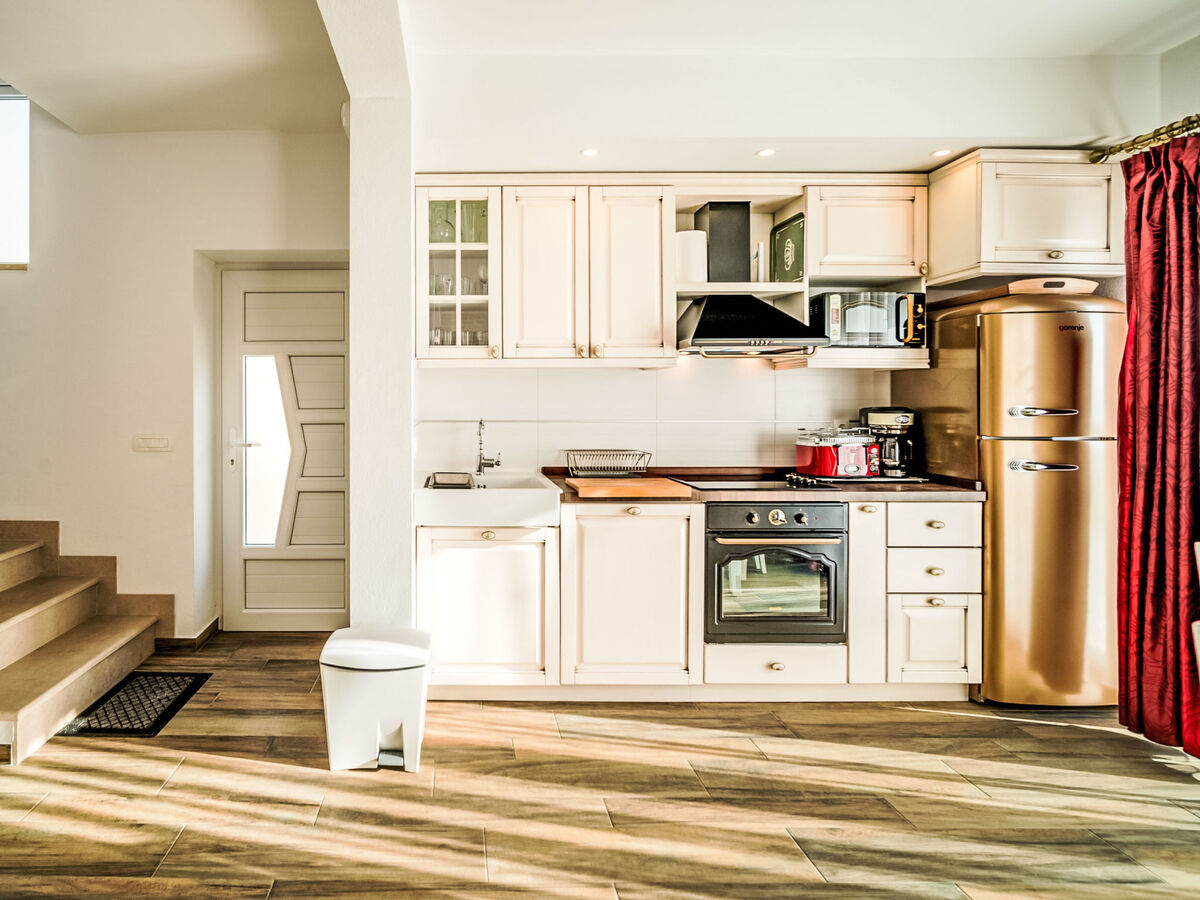 Cuisine ouverte (four, lave-vaisselle, 4 plaques vitrocéramiques, micro-ondes, congélateur).