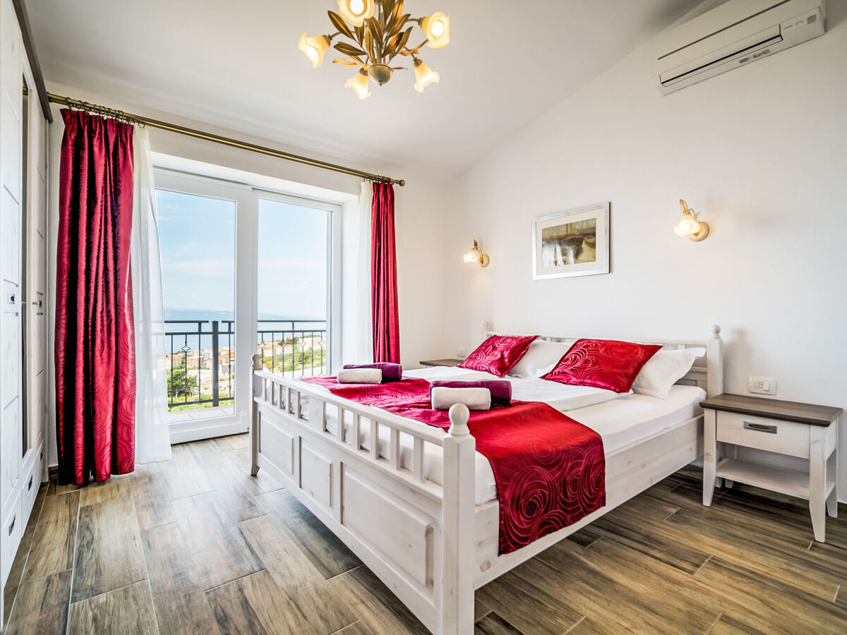 À l'étage supérieur: 2 chambres, chaque chambre avec: 1 grand-lit (180 cm, longueur 200 cm), douche/WC et TV (satellite) (écran plat), air-conditionné.