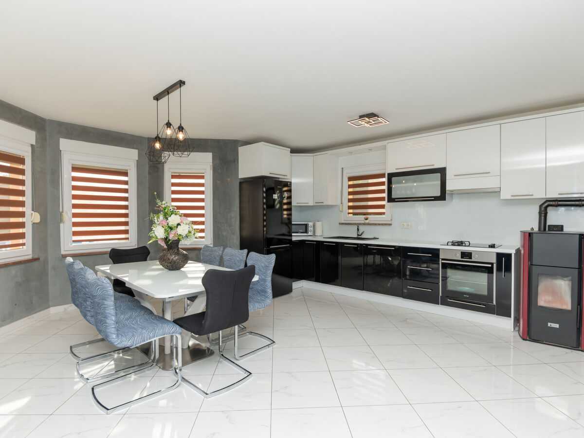 Cuisine ouverte (four, lave-vaisselle, 4 plaques vitrocéramiques, bouilloire électrique, micro-ondes, congélateur, cafetière électrique).