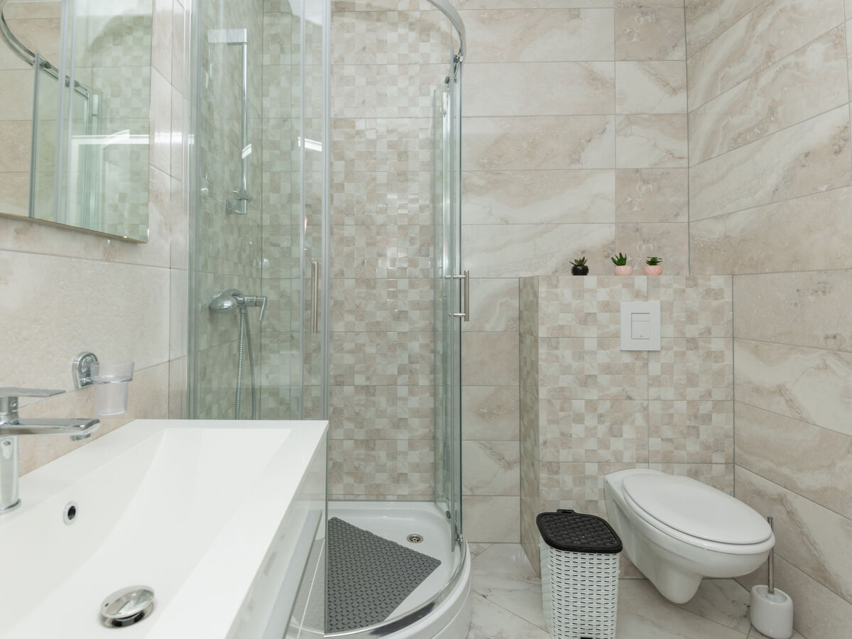 1 chambre avec 1 grand-lit (180 cm, longueur 200 cm), douche/WC et air-conditionné.