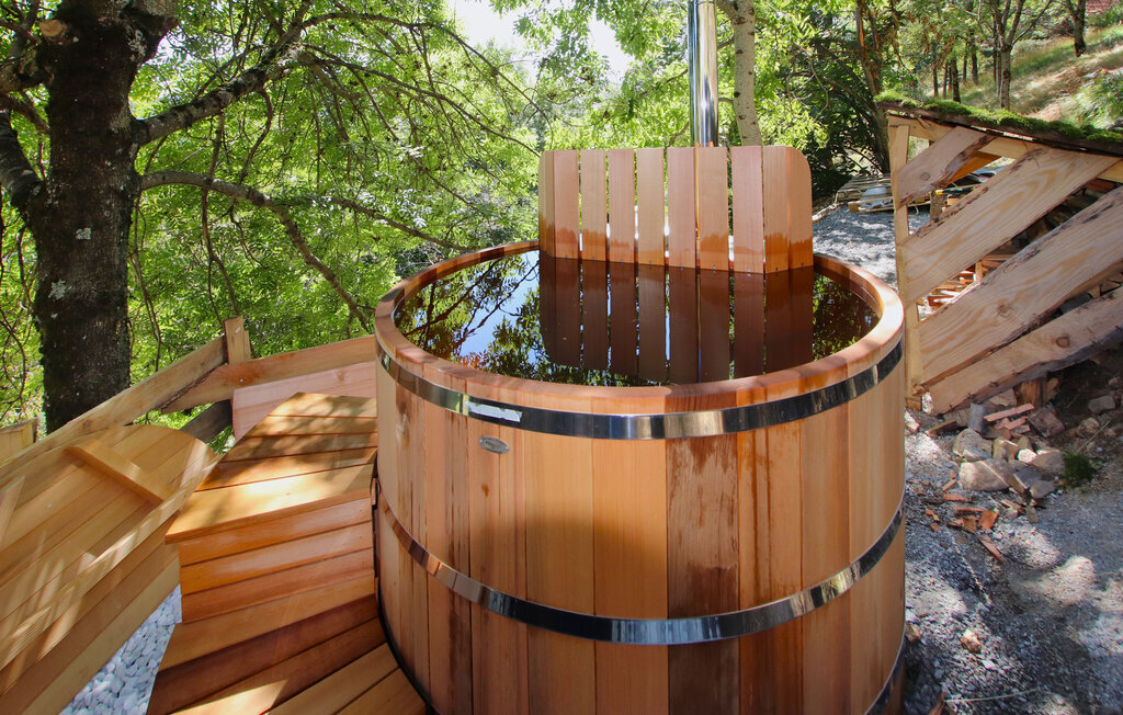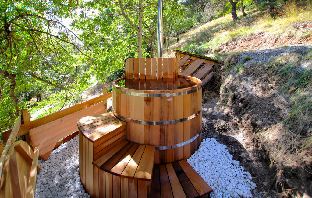 Bien-être à l'extérieur : Location de vacances disposant de chaises-longues et d'un ou plusieurs équipements tels que piscine extérieure, jacuzzi extérieur, lit à baldaquin de jardin etc...