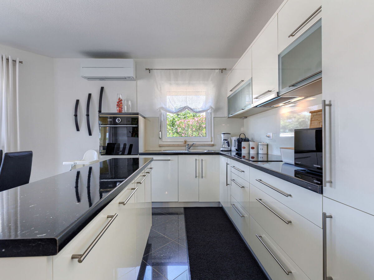 Cuisine ouverte (four, lave-vaisselle, 4 plaques vitrocéramiques, grille-pain, micro-ondes, congélateur, cafetière électrique).