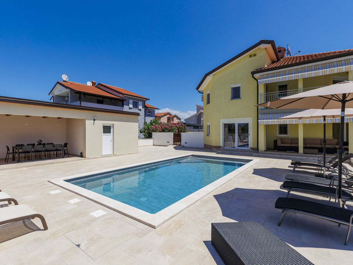 A usage privé: terrain 850 m2 (clôturé), jardin avec pelouse, piscine rectangulaire (9 x 4 m, profondeur 145 cm, disponibilité saisonnière: 01.Mai.