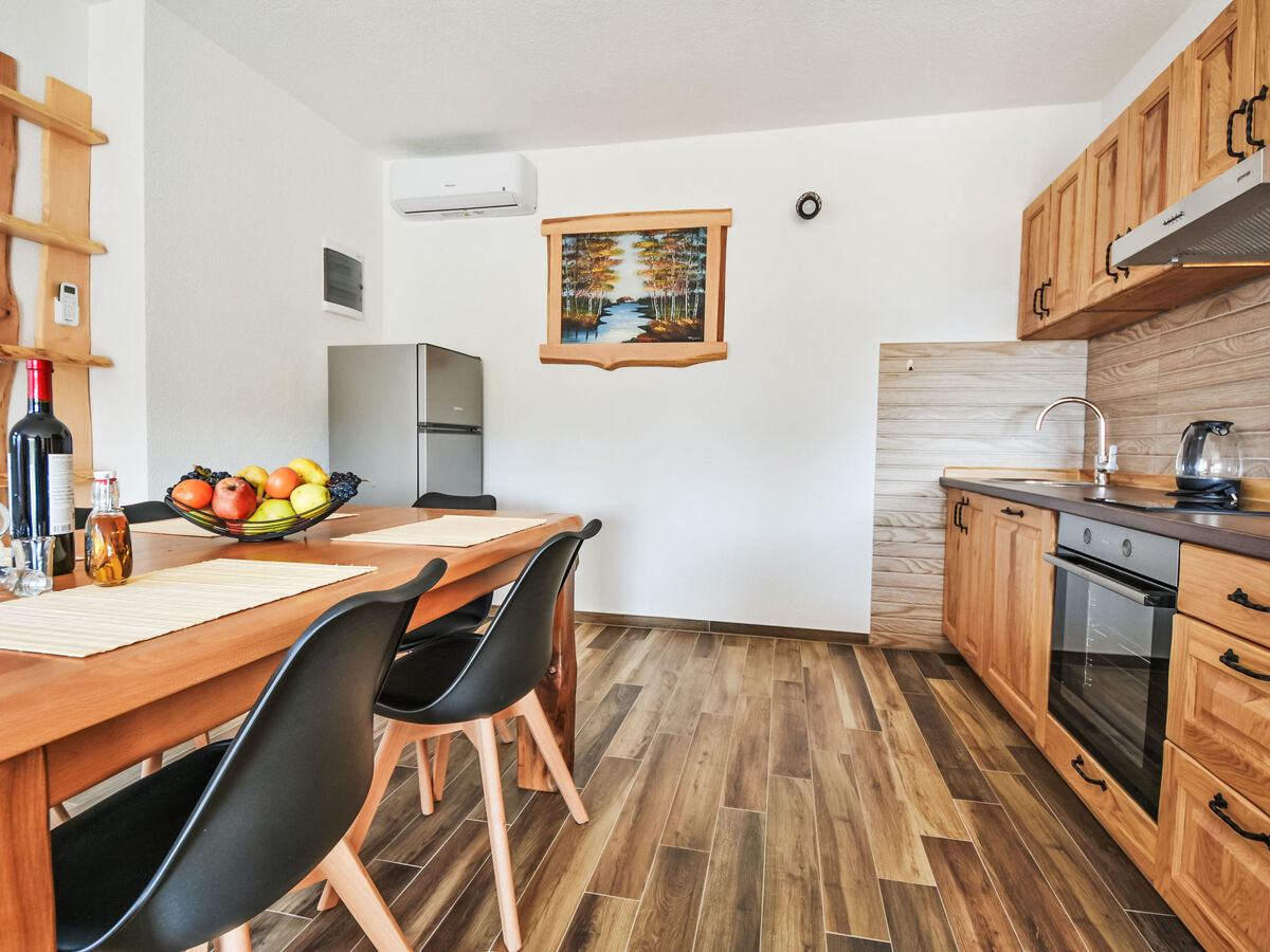 Cuisine ouverte (four, 4 plaques vitrocéramiques, congélateur, cafetière électrique) avec air-conditionné.