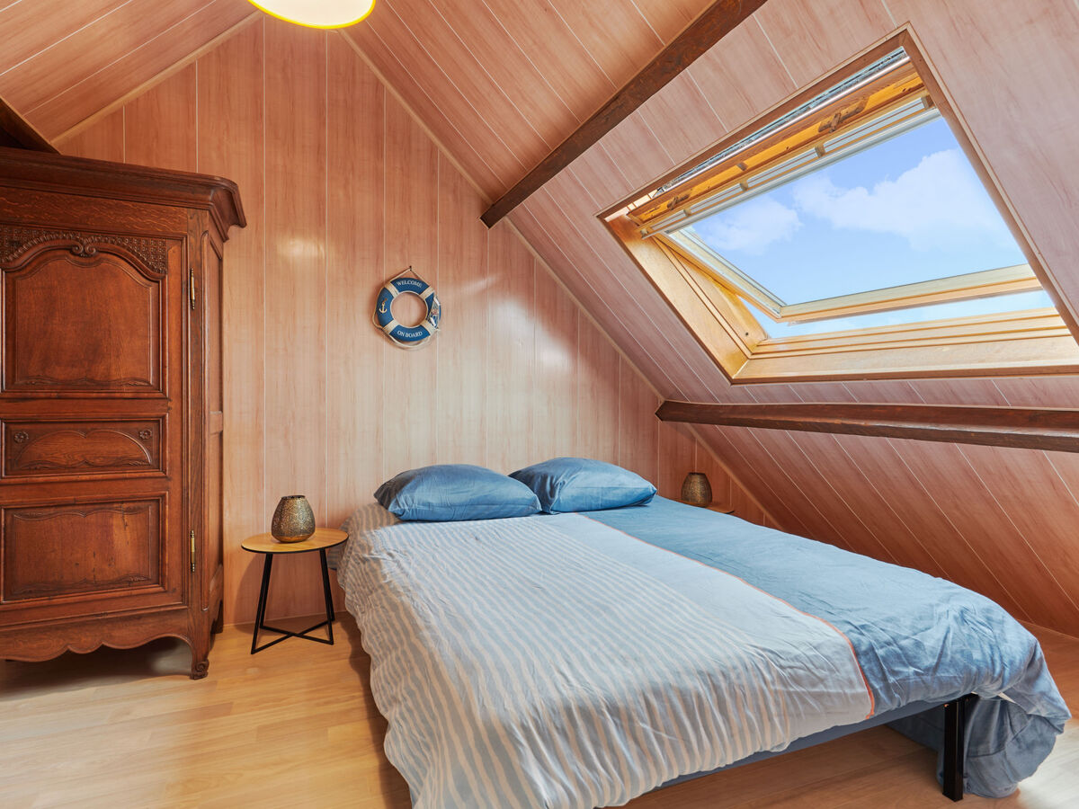 À l'étage supérieur: 1 chambre avec 1 grand-lit (140 cm, longueur 190 cm).