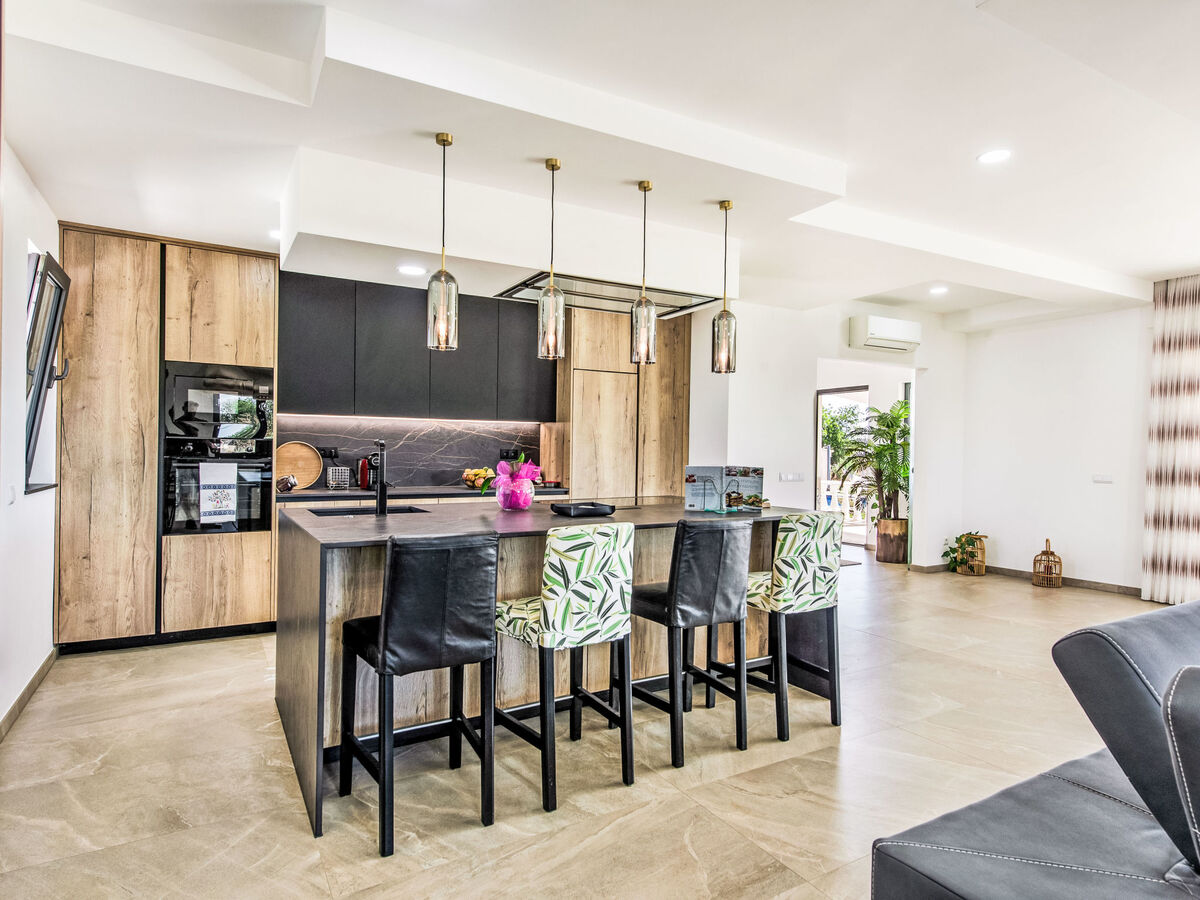 Cuisine ouverte (four, lave-vaisselle, 4 plaques vitrocéramiques, grille-pain, bouilloire électrique, micro-ondes, congélateur, cafetière électrique, ilot de cuisine).