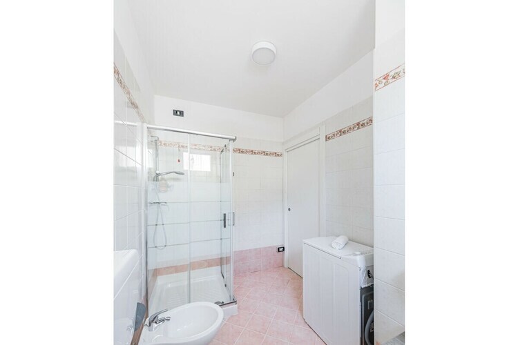 La salle de bain avec douche, lavabo, bidet, WC et lave-linge complète l'équipement de cet appartement.