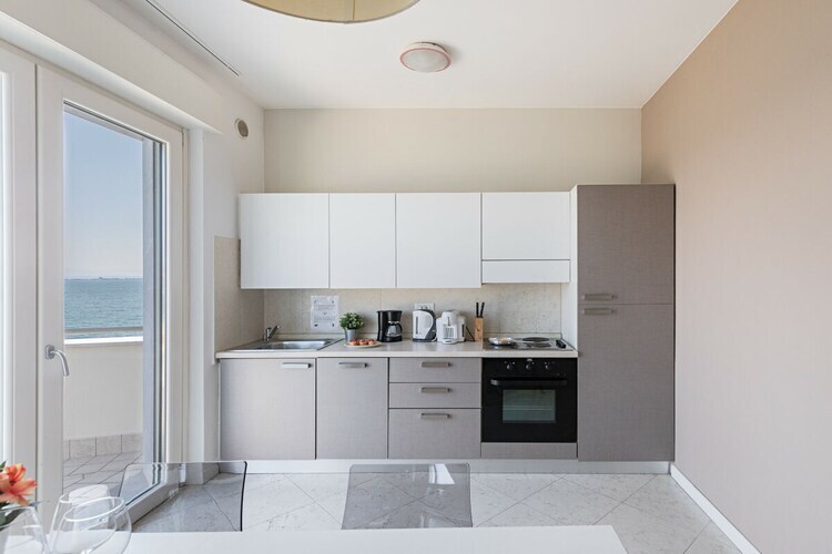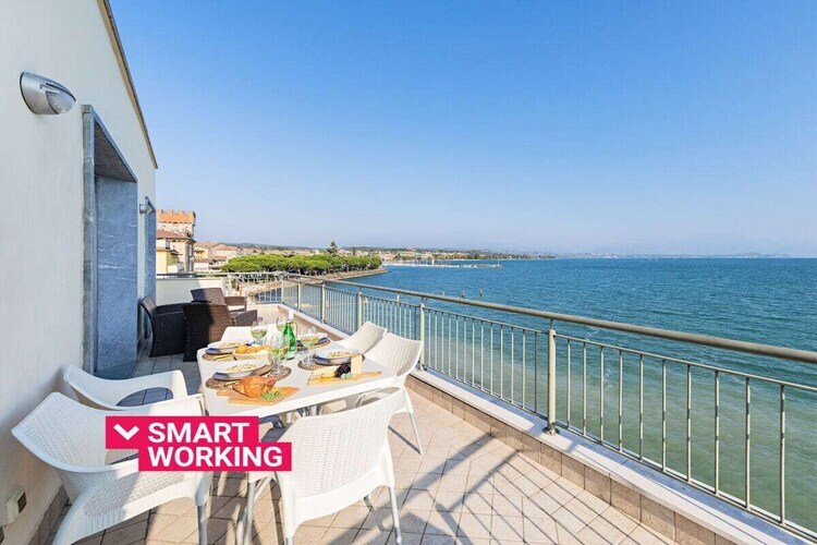 Appartement moderne de deux chambres avec vue sur le lac à Residenza Miralago avec piscine à débordement et jardin communs, à quelques pas du centre de Desenzano del Garda et avec accès direct à la promenade et à la plage publique.