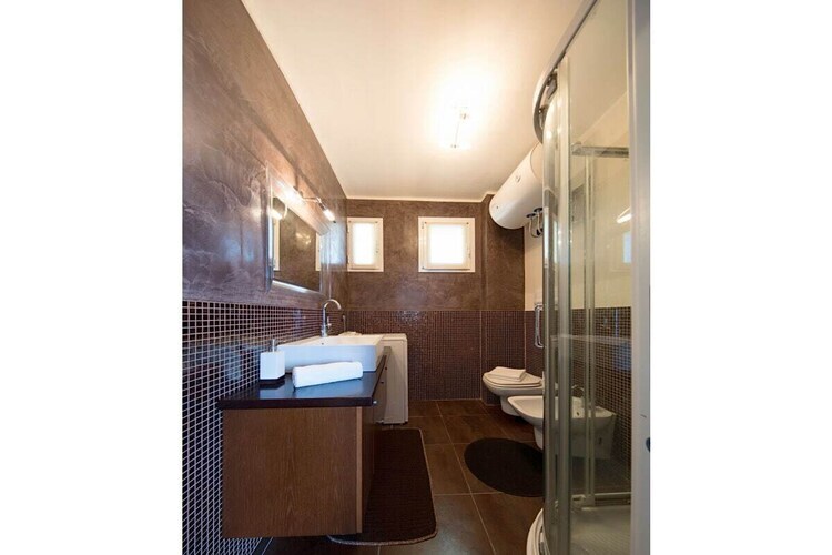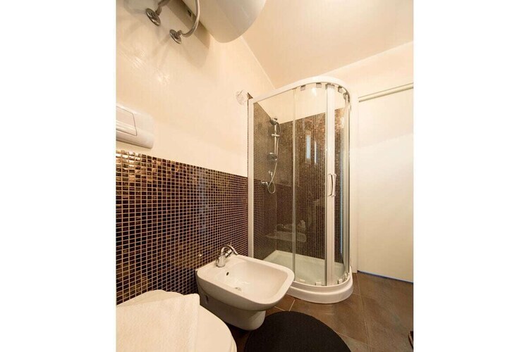 Une salle de bain avec douche, lavabo, WC, bidet et lave-linge complète le plan d'étage de ce logement de vacances merveilleusement situé.