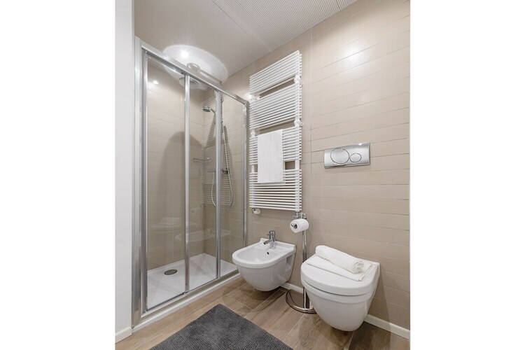 L'appartement est complété par la salle de bain avec douche, lavabo, WC, bidet et lave-linge dans le couloir.