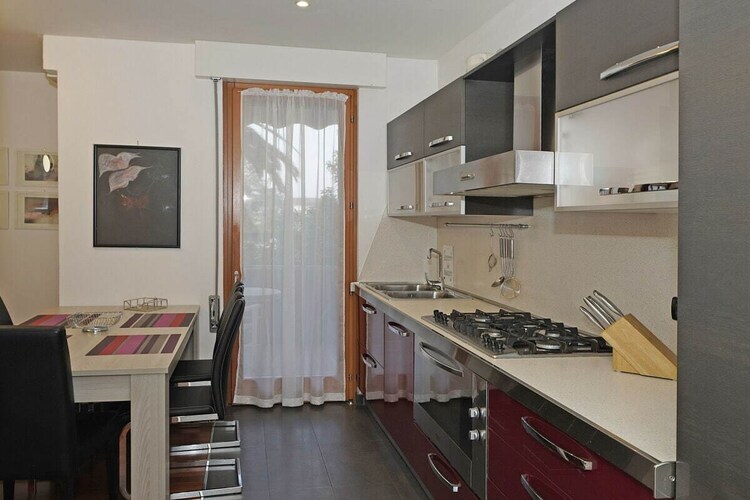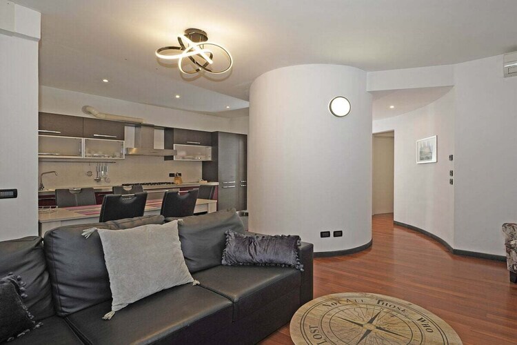 La spacieuse pièce ouverte est meublée d'un canapé double en cuir situé en face de l'unité murale qui abrite une télévision. Derrière le canapé se trouvent une table à manger et une cuisine ouverte moderne, équipée de toutes les commodités telles qu'un four, un lave-vaisselle et une machine à café américaine. Une porte fenêtre mène au balcon équipé d'une petite table.