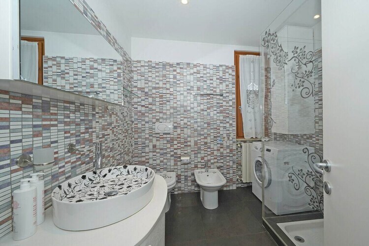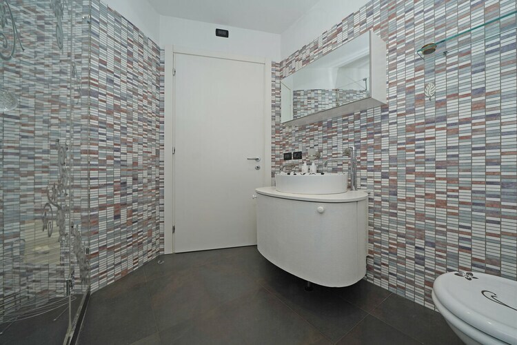 Une salle de bain avec douche décorée de carreaux de mosaïque complète le logement.