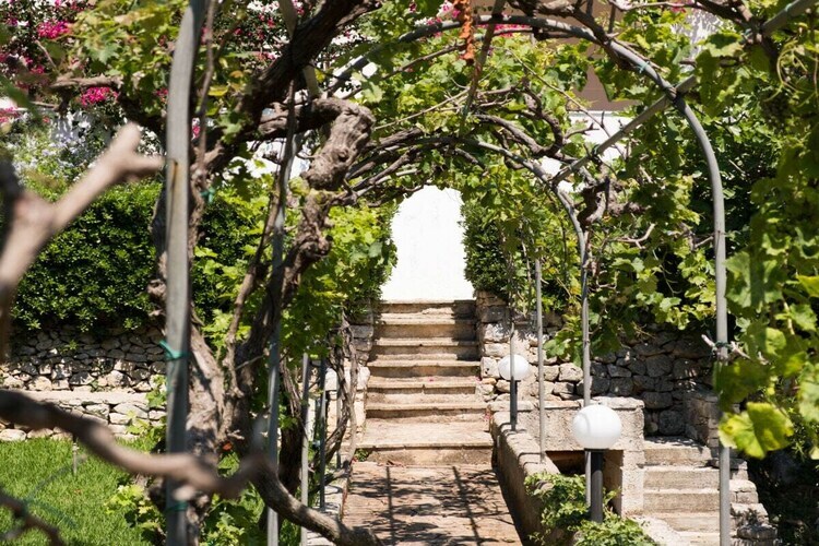 L'appartement est élégamment meublé et se caractérise par les murs blancs et les décorations rappelant les couleurs typiques d'Ostuni.